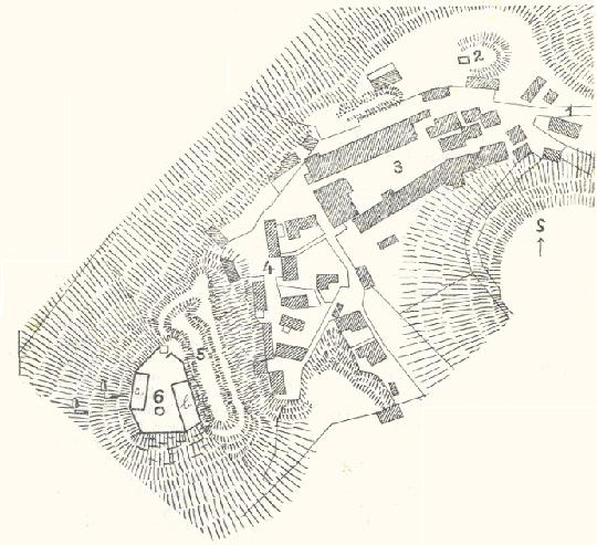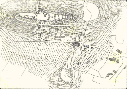1. Původní, stará vozová cesta vede do předhradí a pod baštou (2) nyní zde stojí kaplička. 3. býv. poplužní dvůr, nyní na množství chalup rozparcelovaný. 4. vesnička Budy, tato oddělena od hradu příkopem [mezi 4 a 5], 5. druhý příkop. 6. hlav. hrad. brány do hlav. hradu. ( studně, a] čelední místnosti, zbrojnice a pod. b] hlavní obytný palác.