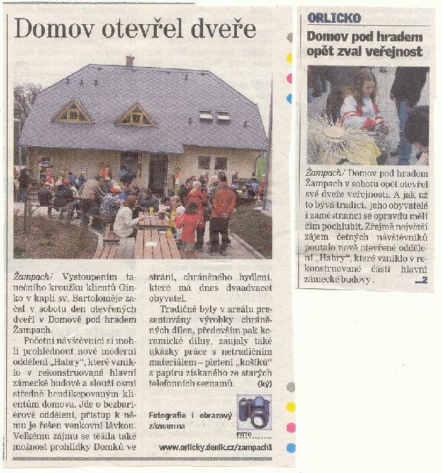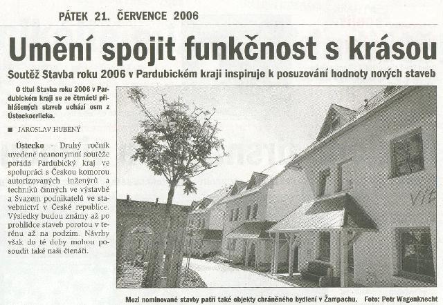 Rok 2006: Domky ve stráni Žampach, chráněné bydlení byly zařazeny mezi nominované stavby soutěže Stavba roku 2006 v Pardubickém kraji.