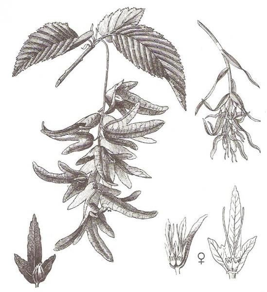 Habr obecný - Carpinus betulus, vpravo pestíková jehněda a samičí květ |
