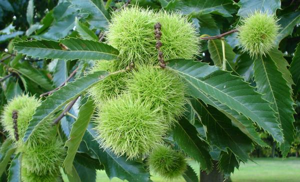 KAŠTANOVNÍK (CASTANEA) Čeleď: Bukovité (Fagaceae) Řád: Bukotvaré (Fagales) Kaštanovníky náležejí do čeledi bukovitých neboli číškonosných (Fagaceae), tj. do příbuzenstva buků a dubů. Jsou to krásné stromy nebo keře s jednoduchými, podlouhle kopinat listy, s hrubě pilovitým okrajem. V mírném a meridionálním pásmu severní polokoule roste 12 druhů. U nás bývá nejčastěji pěstován kaštanovník jedlý (Castanea sativa) původní v oblasti Středozemního moře a Kavkazu. Je to strom dorůstající výšky 20 - 30 m, s korunou rozložitě kuželovitou nebo polokulovitou, hustě zavětvenou. Plody jsou až 2,5 cm velké nažky známé jako "jedlé kaštany", které jsou uzavřeny v silně ostnité číšce pukající v době zralosti několika chlopněmi. Jehnědy okolo 15 cm dlouhé, světle žluté, smíšené – tj. nesoucí současně samčí i samičí květy. Přesto, že se jedná o dřeviny jednodomé, k oplození květů a tvorbě plodů dochází po opylení pylem jiného jedince.