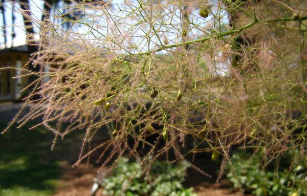 RUJ (COTINUS) Čeleď: Ledviníkovité (Anacardiaceae) Řád: Mýdelníkotvaré (Sapindales) Velmi dekorativní rostliny z čeledi ledviníkovitých (Anacardiaceae), zastoupené pouze 2 druhy původními na severní polokouli. Ruj vlasatá (Cotinus coggygria), přirozeně rozšířená od střední a jižní Evropy až po střední Čínu, okrajově zasahuje i na území východního Slovenska. Např. u obce Timoradza lokalita výskytu získala charakteristický název tzv. Smradľavý vršok. Je to keř nebo nízký strom ozdobný zejména svým plodenstvím. Z drobných květů, vyrůstajících v bohatých vzpřímených latách, je jen málokterý oplozen, aby se následně přeměnil v plod – drobnou peckovici. Květní stopky po odkvětu a opadu květů v latě vytrvávají, prodlužují se a stříbřitě chlupatí, takže celé květenství v době dozrání plodů vypadá jako malý nadýchaný obláček s několika tečkami – dozrávajícími plody. Lidové názvy „kouřící strom, hořící keř, parukový strom“ velice dobře vystihují vzhled této rostliny. Z přírodní formy bylo vyšlechtěno několik okrasných kultivarů odlišných vzrůstem, zbarvením listů a květenství. Obzvláště nápadný je kultivar ´Royal Purple´ s temně červeně zbarvenými listy u kterého se dekorativní účinek násobí kontrastem se světle zbarvenými ochmýřenými květenstvími. V našem arboretu naleznete také kultivar se zlatožlutě zbarveným olistěním ´Golden spirit´.