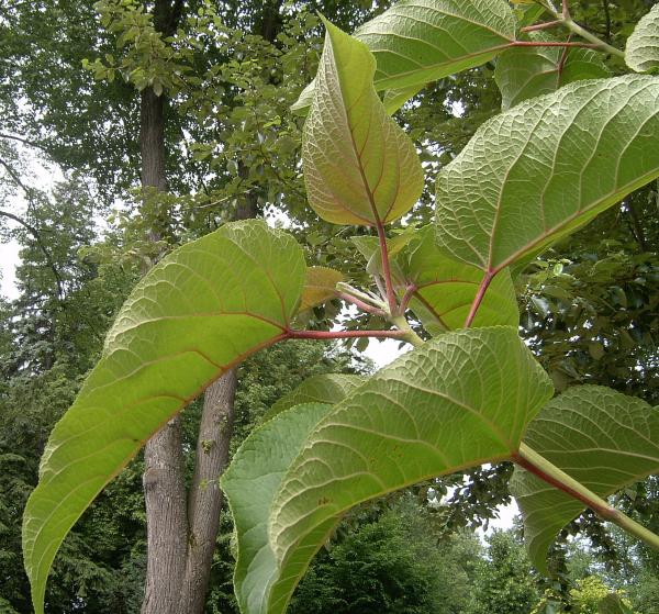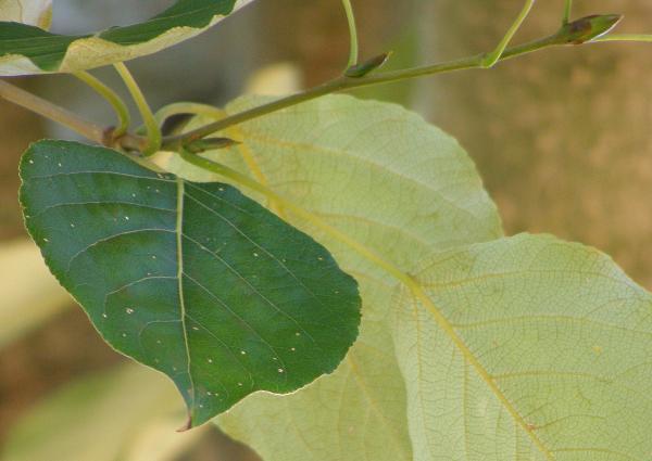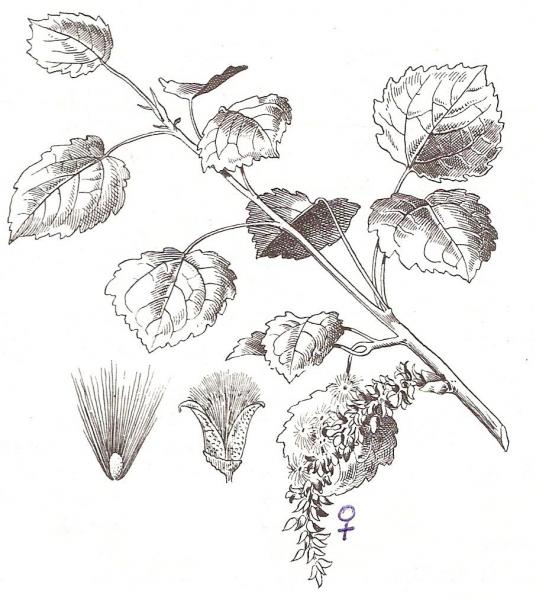 Jedním z nejkrásnějších topolů vůbec je topol chlupatý (Populus lasiocarpa), pocházející ze střední Číny. Je to 10-20 m vysoký strom s kulovitou ale řídkou korunou a velkými listy, které bývají 15-30 cm dlouhé, zespodu světleji plstnaté, s načervenale zbarvenou žilnatinou i řapíky. Samičí jehnědy za zralosti cca 15 až 24 cm dlouhé.