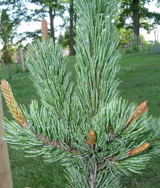 Borovice lesní (Pinus sylvestris), lidově též sosna je strom vyskytující se na území České republiky přirozeně od nížin až do nadm. výšky 1000 m., dožívající se stáří 300 – 350 let, dorůstající velikosti až 40 m. Původně byla sosna součástí zejména borových doubrav, ze kterých je postupně agresivnějším dubem vytlačována na méně hostinná písčitá stanoviště, kde již jí dub nekonkuruje a vytváří zde samostatný vegetační stupeň bory. Velmi působivá je její rezavá borka vytahující dřevinu z porostu opticky do popředí. Jejího dojmově velmi silného účinku bývá využíváno zejména v krajinářských úpravách, na místech, kde její kmen osvítí červený kotouč zapadajícího slunce. Borovice lesní má jehlice po 2 ve svazečcích, obyčejně zkroucené, namodralé nebo šedavě zelené. Šištice jsou vejčitě kuželovité, symetrické, do 7 cm délky. Její dřevo se používá k výrobě železničních pražců, sloupů, též k výrobě lodí, letadel, apod. Starší borovice jsou zdrojem silic a balzámů, používaných např. k výrobě kalafuny. Z okrasných kultivarů je v našem arboretu zastoupena např. sloupovitě rostoucí borovice s modrozelenými jehlicemi - P. s. ´Pyramidalis glauca´.