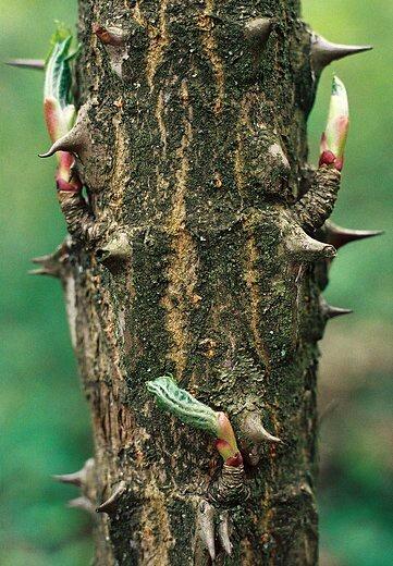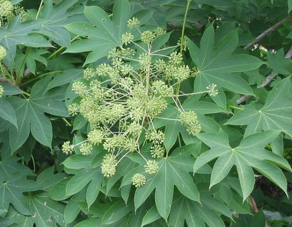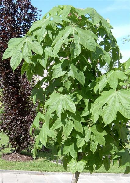 KALOPANAX (KALOPANAX) Kalopanax pestrý (Kalopanax pictus, septemlobus) je jediným druhem tohoto rodu náležejícím do čeledi aralkovitých. Pochází z oblasti Číny, Mandžuska, Koree, Japonska. Je to opadavý strom 6-15 (v domovině až 30) m vysoký s tlustými trnitými větvemi i letorosty, spoře rozvětvený a u nás ojediněle pěstovaný. Listy má dlanitě 5-7 laločnaté až 35 cm v průměru, s dlouhými řapíky (8-50 cm). Květy bílé vytvářející smáčklé laty 20-50 cm široké, plody černé kulovité peckovice cca 0,4 cm v průměru. Náš stromek byl dovezen (ve velikosti cca 15 cm) v roce 1992 z arboreta Kostelec nad Černými Lesy. V parcích arboreta Žampach je možné si prohlédnout kromě základního druhu také jeho varietu ´Maximowiczii´ s mimořádně velkými, hluboce členitými, z rubu chlupatými listy. Kalopanax má rád živné, vlhké půdy, snáší značný zástin.