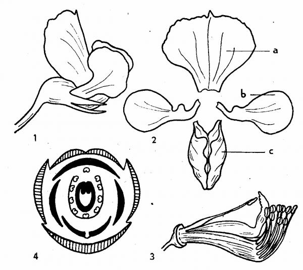 Skupina těchto rostlin je označována také „motýlokvěté“ podle charakteristické stavby květu. Tyto jsou složeny obvykle z 5 víceméně do trubky spojených lístků kališních a 5 plátků korunních. Hořejší vnější plátek tvoří tzv. pavézu /a/ a 2 postranách tzv. křídla /b/. Spodní srostlé plátky tvoří tzv. člunek /c/. Plodem motýlokvětých je lusk. Botanicky je čeleď motýlokvětých (papilionaceae) vřazena do jedné čeledě sapanovitých (cesalpiniacceae), která pak obsahuje 430 rodů o cca 7000 druzích bylin, keřů a stromů. Obrázek – stavba květu s motýlovitou korunou .