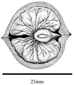 Rychlerostoucí ořechovec srdcovitý (Carya cordiformis) vytváří plody okolo 3 – 4 cm velké s hořkými jádry. Skořápka je hladká, nad polovinou žebernatá a na vrcholu výrazně zašpičatělá. Pupeny jsou nápadně žluté a štíhlé, borka dlouho hladká, ve stáří pouze mělce brázditá.