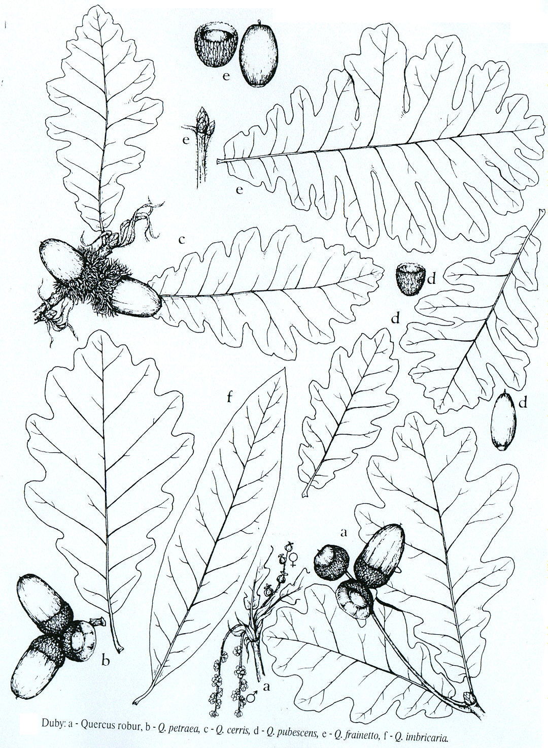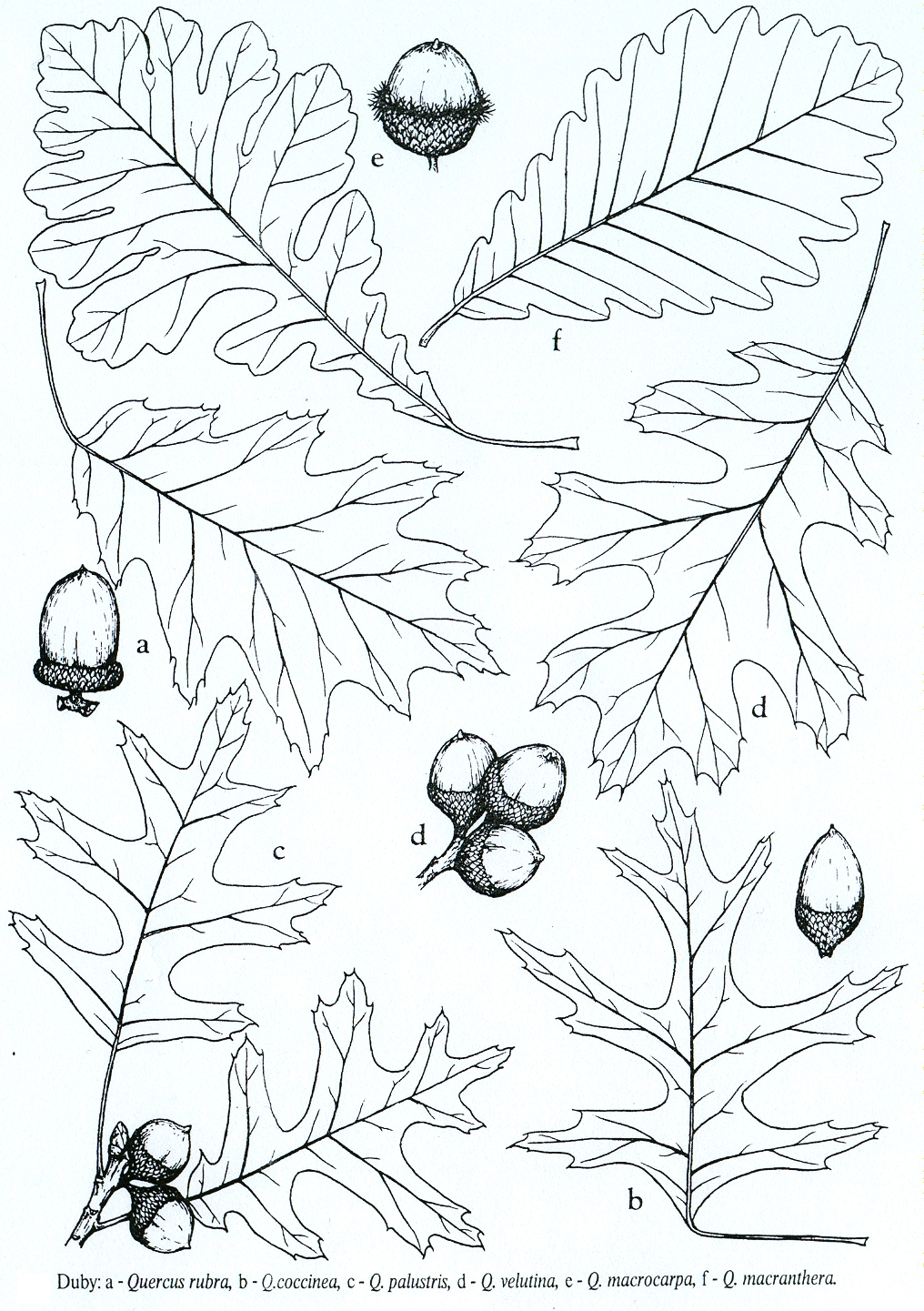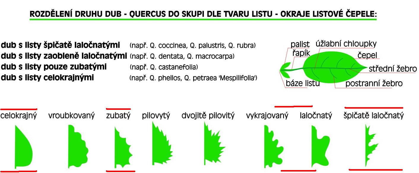 (jehněda = jednoduché hroznovité převislékvětenství, s květy téměř přisedlými,v celku opadavé) (letorost = větévka dřeviny vyrostlá v jednom vegetačním období) Velmi bohatý rod Quercus je možno rozdělit do několika skupin, obsahující buď rostliny s podobnými nároky, habitem či některými dalšími znaky. Například duby s listy špičatě laločnatými (např. Q. coccinea, Q. palustris, Q. rubra), duby s listy zaobleně laločnatými (např. Q. dentata, Q. macrocarpa), duby s listy pouze zubatými (např. Q. castaneifolia) či duby s listy celokrajnými (např.Q. phellos, Q. petraea ´Mespilifolia´); existují jak duby opadavé (většina druhů u nás pěstovaných), tak duby polostálezelené či stálezelené, které jsou pro naše podmínky v některých případech příliš choulostivé (např. Q.×turneri ‘Pseudoturneri’). Tvar okraje listové čepele - podle obr. Mojžíšek.