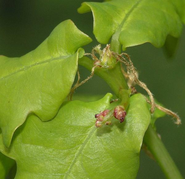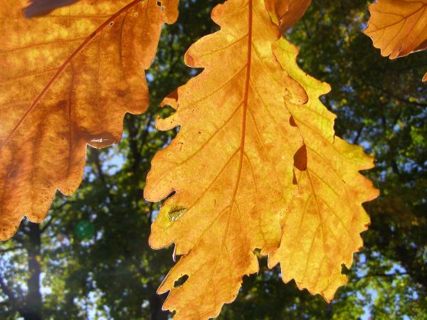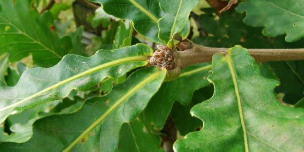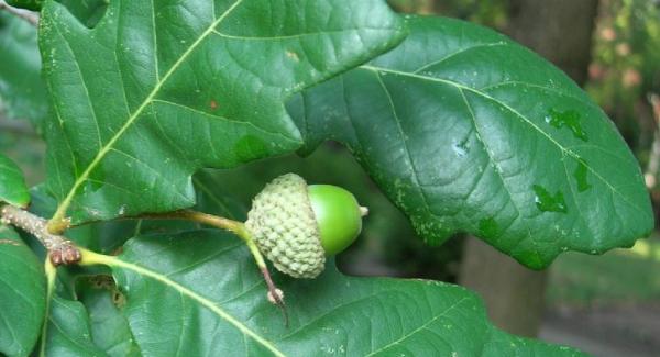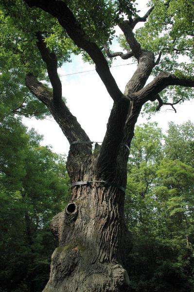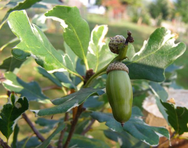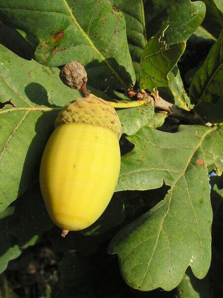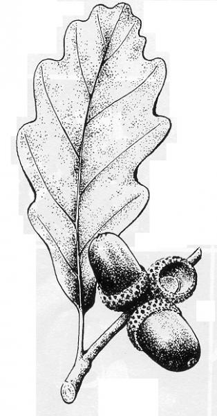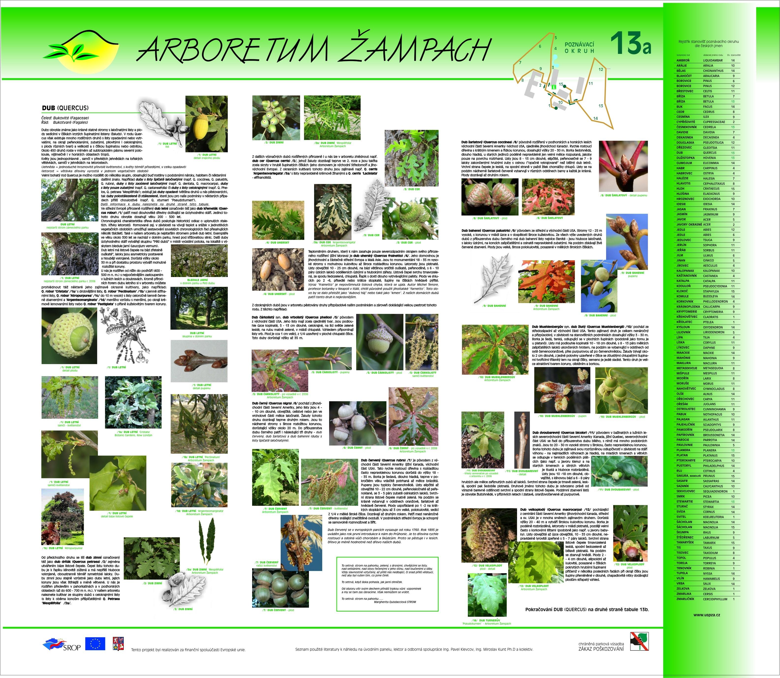 Další informace k dubu naleznete také na druhé straně této tabule. ________________________ Ve střední Evropě přirozeně rozšířený dub letní označovaný též jako dub křemelák (Quercus robur) /1/ patří mezi dlouhověké dřeviny dožívající se úctyhodného stáří. Jedinci tohoto druhu obvykle dosahují věku 200 – 500 let. Chronologická charakteristika dřeva dubů poskytuje historický obraz o uplynulých staletích. Křivkyletokruhů formované zej. v závislosti na vývoji teplot a srážek v jednotlivých vegetačních obdobích umožňují sestavování souvislých chronologických řad přesahujících několik tisíciletí. Také v našem arboretu je nejstarším stromem právě dub letní. Exemplář ve věku okolo 300 let se nachází v dolním parku, hned pod křižovatkou silnic. Další duby úctyhodného stáří vytvářejí skupinu „Pěti dubů“ v místě vyústění potoka, na lokalitě s výskytem bledulejarní (Leucojum vernum). Info tabulka - lokalita U pěti dubů - zde. Dub letní má listové čepele na bázi zřetelně „ouškaté“, laloky jsou asymetricky postavené a hlouběji vykrojené. Dorůstá výšky okolo 30 m a při dostatku prostoru vytváří mohutné rozložité koruny. U nás je rozšířen od nížin do podhůří (400 – 500 m n. m.) s nejpočetnějším zastoupením v lužních lesích a doubravách. Kromě přírodních forem dubu letního si v arboretu můžete prohlédnout též některé jeho zajímavé okrasné kultivary, jako například: Q. robur ´Cristata´/1a/ s drobnějšími ozdobně pokroucenými listy, Q. robur ´Pectinatum´/1b/ s jemně stříhanými listy, Q. robur ´Atropurpurea´/1c/ do 10 m vysoký s listy celoročně temně červeně zbarvenými a ´Argenteomarginata´/1d/ menšího vzrůstu s menšími, po okraji krémově lemovanými listy nebo Q. robur ´Fastigiata´ s přísně kuželovitým tvarem koruny.