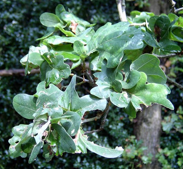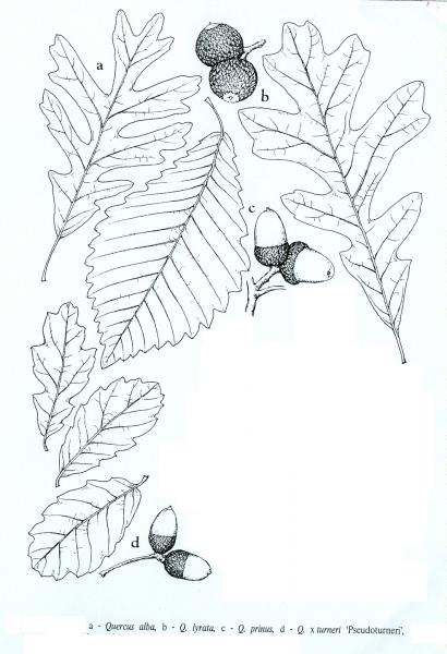 Bývá někdy nazýván dubem císařským. Jeho listy na pohmat připomínají listy pergamenu. Dub Turnerův,kožolistý (Quercus x turnerii) kříženec dubu cesmínového a dubu letního (Q. ilex x Q. robur) vzniklýpřed r. 1780 ve školce pana Turnera v Essenu v Anglii. Je to poloopadavý, 6 – 15 m vysoký stromek s kuželovitou vzdušnou korunou. Letorosty bývají zpočátku plstnaté, později olysávají. Listy eliptičné, 6 – 11 cm dlouhé, s 5 – 6 páry tupých zubů s nasazenou špičkou, Listová čepel svrchu tmavě zelená, vespod na žilnatině chlupatá. Plody po 3 – 7 ve skupině na plstnaté 3 – 5 cm dlouhé stopce. Kultivar Quercus x turnerii ´Pseudoturneri´/16/, který byl zkušebně vysazen také v našem arboretu, se od původní formy odlišuje štíhlejšími listy s výrazněji tvarovanými zuby a méně ochlupenými žilkami na spodní straně listu. Tento kultivar má větší šanci přezimovat v našich klimatických podmínkách. DUB (QUERCUS) - DALŠÍ INFORMACE (doplňující infarmace na zadní straně tabule) Tvar okraje listové čepele - podle obr. Mojžíšek. ROZDĚLENÍ DRUHU DUB - QUERCUS DO SKUPIN DLE TVARU LISTU – OKRAJE LISTOVÉ ČEPELE: