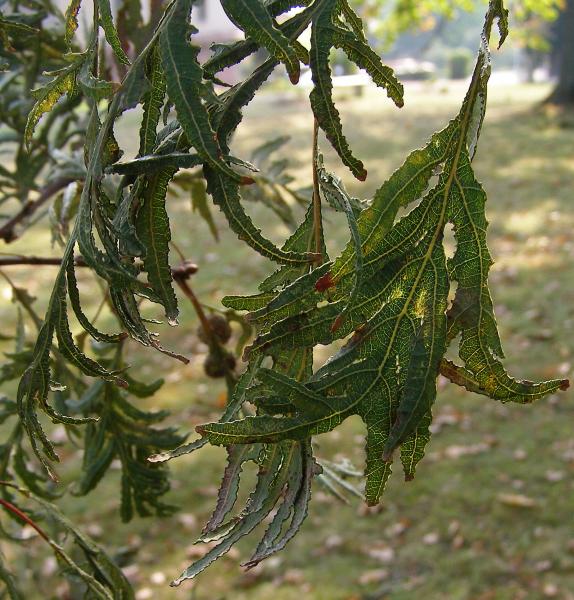 Dub bahenní (Quercus palustris) /9/ původem ze střední a východní části USA. Stromy 12 - 25 m vysoké, s korunou v mládí úzce a v dospělosti široce kuželovitou. Ze všech výše uvedených druhů dubů z příbuzenstva dubu černého má dub bahenní listy nejvíce členité - jsou hluboce laločnaté, s laloky úzkými, na koncích zašpičatělými a osinatě nepravidelně zubatými. Na podzim získávají živě červené zbarvení. Plody jsou velké, široce polokulovité, posazené v mělkých širokých číškách.