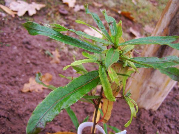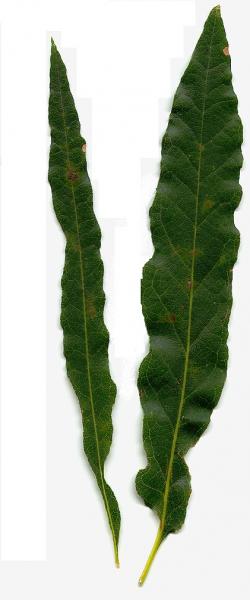 Dub čárkolistý syn. dub vrbolistý (Quercus phellos) /5/ původem z východní části USA. Jeho listy mají zcela ojedinělý tvar. Jsou podlouhle úzce kopinaté, 5 – 13 cm dlouhé, celokrajné,na líci světle zelené lesklé, na rubu matně zelené, v mládí chlupaté. Vzhledem připomínají listy vrb. Plod je cca 1 cm velký, z 1/4 uzavřený v ploché chlupaté číšce. Tyto duby dorůstají výšky až 35 m.