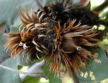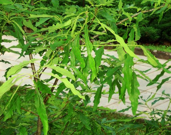 Dub zubatý (Quercus dentata) /15/ pochází z Japonska, Koreje, Mandžuska a Číny, kde se přirozeně vyskytuje od nížin až do hor. Jsou to stromy 15 – 25 m vysoké s kulovitou korunou a silnou hluboce rozbrázděnou borkou. Listy mají obvejčité, 15 – 40 cm dlouhé, chobotnatě laločnaté, na líci tmavozelené lesklé, na rubu šedozelené a hnědavě chlupaté. Podzimní zbarvení listů bývá hnědavé, za suchého počasí však mohou překvapit i nádhernými odstíny temně červené a šarlatové. Žaludy tohoto dubu jsou posazené v číškách krytých dlouhými tenkými listenovitými šupinami, které od číšky odstávají jako rozčepýřená peříčka a činí je tak velmi nápadnými.