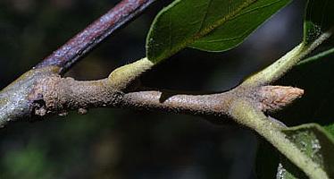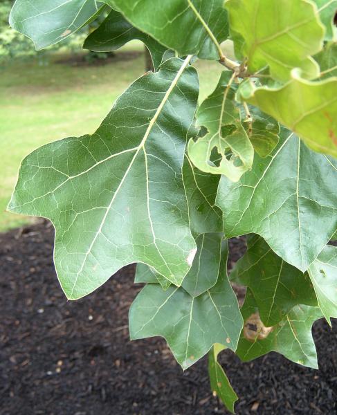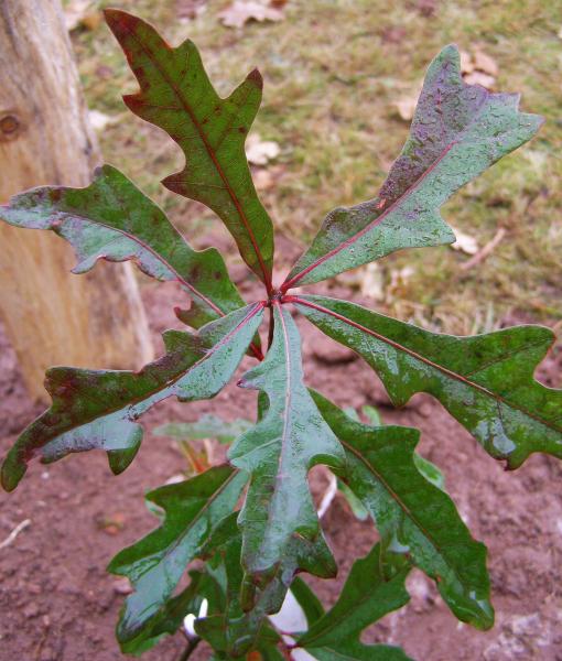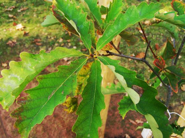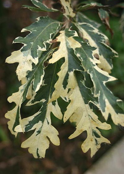 Dub dvoubarevný (Quercus bicolor) /11/ původem v bažinatých a lužních lesích severovýchodní části Severní Ameriky (Kanada, jižní Quebec, severovýchodní část USA) se řadí do příbuzenstva dubu bílého, s nímž má mnoho podobných znaků. Jsou to 20 – 30 m vysoké stromy s širokou, často nepravidelnou korunou. Borka tohoto dubu je zajímavá svou rozrůzněnou odlupčivostí v závislosti na stáří výhonu – na nejmladších výhonech je hladká, na mladých kmenech a větvích se odlupuje v tenkých podélných plátcích (jako např. u javoru klenu) a na starých kmenech a silných větvích je tlustá a hluboce rozbrázděná. Listy jsou 10 – 18 cm dlouhé, obvejčité, s klínovitou bází a 6 – 8 páry hrubých ale mělce zaříznutých zubů až laloků. Svrchní strana čepele je tmavě zelená, lesklá, spodní pak šedobíle plstnatá. Druhové jméno tohoto dubu je odvozeno právě od výrazné barevné odlišnosti svrchní a spodní strany listové čepele. Podzimní zbarvení listů je obvykle žlutohnědé, v příznivých letech i zlatavé, oranžovočervené až purpurové.