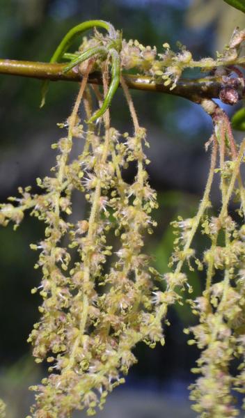 Dub Muehlenbergův syn. dub žlutý (Quercus Muehlenbergii) /10/ pochází ze středozápadní až východní části USA. Tento zajímavý druh je celkem nenáročný a přizpůsobivý, v závislosti na stanovištních podmínkách dosahující výšky 3 - 30 m. Borka je šedá, tenká, odlupující se v plochých šupinách (podobně jako tomu je u platanů). Listy má podlouhle kopinaté 10 – 18 cm dlouhé, s 8 – 13 páry mělkých zašpičatělých laloků ukončených hrotem, na podzim se vybarvující v stínech od syté červenooranžové, přes purpurovou až po červenohnědou. Žaludy bývají okolo 2 cm dlouhé, z jedné poloviny uzavřené v číšce se ztlustlými chlupatými šupinami tvořícími třásnitý lem na okraji číšky, semeno je jedlé sladké. Tento druh je velice atraktivní tvarem koruny, olistěním a borkou.