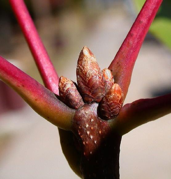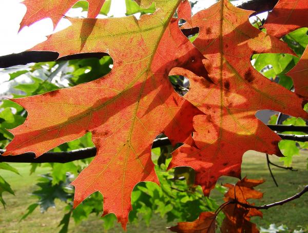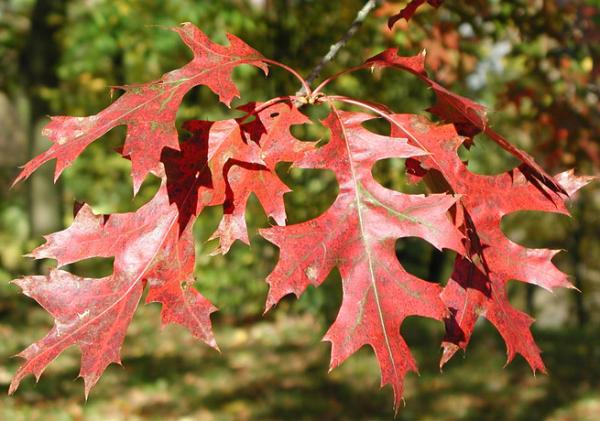 Dub červený (Quercus rubra) /7/ je původem z východní části Severní Ameriky (jižní Kanada, východní část USA). Tato rychle rostoucí dřevina s rozkladitou často nepravidelnou korunou dorůstá do výšky 18 – 35 m. Borka je šedavá, dlouho hladká, teprve v pokročilém věku vrásčitě potrhaná až mělce brázditá. Pupeny jsou typicky červenohnědé. Listy eliptičné až obvejčité 10 – 22 cm dlouhé, peřenolaločnaté až peřenoklané, se 3 – 5 páry zubatě osinkatých laloků. Svrchní strana listové čepele matně zelená. Na podzim se krásně vybarvují v odstínech oranžové, šarlatové až hnědavěčervené. Plody uspořádané po 1 – 2 na krátkých stopkách jsou až 3 cm velké, polokulovité, sedící z 1/4 v mělké široké číšce. Dozrávají až druhým rokem. Patří mezi nenáročné dřeviny snášející znečištěné ovzduší. V podmínkách střední Evropy je schopný se samovolně rozmnožovat a šířit.