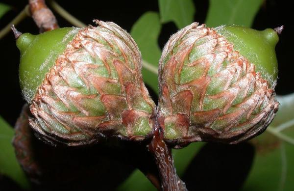 Dub velkoplodý (Quercus macrocarpa) /12/ pocházející z centrální části Severní Ameriky (jihovýchodní Kanada, střední a sv. USA) je v mnoha směrech zajímavým druhem. Dorůstá výšky 20 – 40 m a vytváří širokou kulovitou korunu. Borka je podélně rozbrázděná, letorosty v mládí plstnaté, později velmi často s korkovými lištami (obdobně jako např. u javoru babyky). Listy obvejčité až úzce obvejčité, 10 – 35 cm dlouhé, nepravidelně lyrovitě zpeřené s 5 – 7 páry laloků. Svrchní strana listové čepele tmavozelená lesklá, spodní šedozeleně až bělavě plstnatá. Na podzim se zbarvují hnědě. Plody 2 – 4 cm dlouhé, elipsoidní až kulovité, posazené v číškách pokrytých hrubými šupinami přičemž v několika posledních řadách při okraji číšky jsou šupiny přeměněné v dlouhé, chapadlovité nitky dodávající plodům střapatý vzhled.