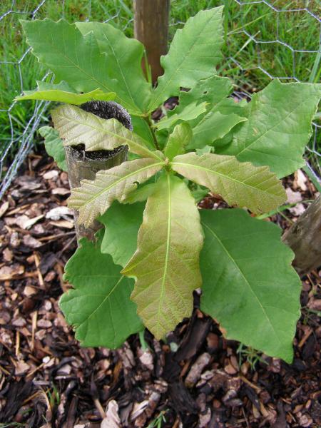 Dub kaštanolistý (Quercus castaneaefolia) /14/ je zajímavým druhem přirozeně rozšířeným v podhorských lesích Arménie, Kavkazu a severního Íránu. Jsou to velice krásné, až 30 m vysoké stromy. Borka na kmenech zůstává hodně dlouho hladká. Listy velmi připomínají listy kaštanovníku setého – jsou až 18 cm dlouhé, temně zelené s lesklým povrchem a výrazně zubatými okraji. Žaludy bývají až 3 cm dlouhé, z 1/3 skryté ve střapaté číšce. V arboretu je vysazen kultivar Quercus castaneaefolia ´Green Spire´ vytvářející sloupovitou korunu.