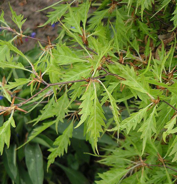 ´Atropurpurea´ - červenolistý kultivar, intenzívně vybarvený však pouze na začátku vegetace; ´Albovariegata´ - listy užší než původní druh, na okraji nepravidelně vykrajované a žlutobílé; ´Luteovariegata´ - listy užší a menší než původní druh, na okraji nepravidelně vykrajované, se žlutým lemem; ´Tricolor (= Roseomarginata)´ - listy se zvlněnými okraji, mělce zubaté, okraj bílozelený a červený; ´Asplenifolia´ - výrazně střihané listy; ´Rohanii´ - užší, tmavě červené, zubaté listy, částečně deformované; ´Quercifolia´ - listy menší než původní druh, okraje hluboce vykrajované a zvlněné; ´Zlatia´ - při rašení listy zlatožluté, později zelenožluté.