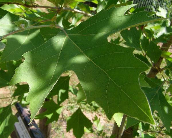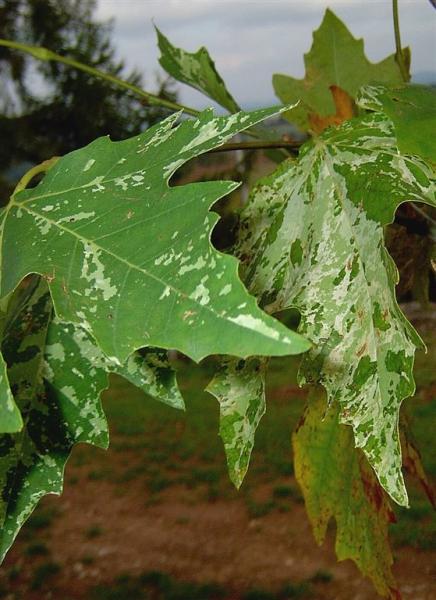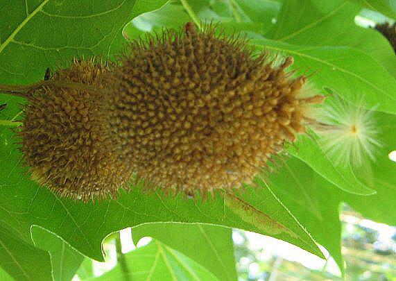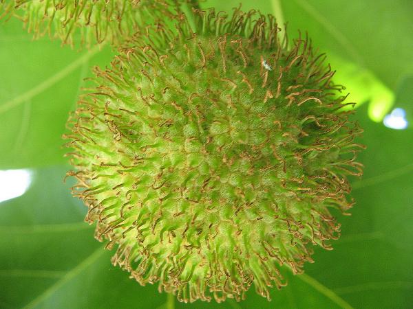 V horní části parku je vysazen též platan východní (Platanus orientalis), původem z jihovýchodní Evropy a Malé Asie. Borka tohoto asi 30 m vysokého stromu se pro změnu odlupuje ve velmi velkých plátech, jeho 5 – 7 laločné listy jsou velmi hluboce vykrojené až po střed čepele a plodenství visí na stopce po 3 - 6. Tento druh platanu není v našich podmínkách příliš dobře zimovzdorný a proto není příliš často pěstován. ____________ Platanům obecně vyhovují hluboké, živné, provzdušněné a hlavně teplé půdy na slunném stanovišti. Potřebují dostatek vláhy. Znečištěné ovzduší zvládají. Jejich současným trápením jsou tracheomykózy. Díky svým robustním rozměrům potřebují dostatek prostoru a proto bývají vysazovány jako efektní solitéry nebo alejové stromy zejména v městské zeleni. Z nahnědlého jádrového dřeva se vyrábí vysoce kvalitní drahý nábytek. Velmi světlá dřevní běl se používá pro práce intarzní. Chlupaté rozpadavé plodenství a listy mohou způsobovat alergické reakce dýchacích orgánů a očí. Více - stavba dřeva - obrázek. |