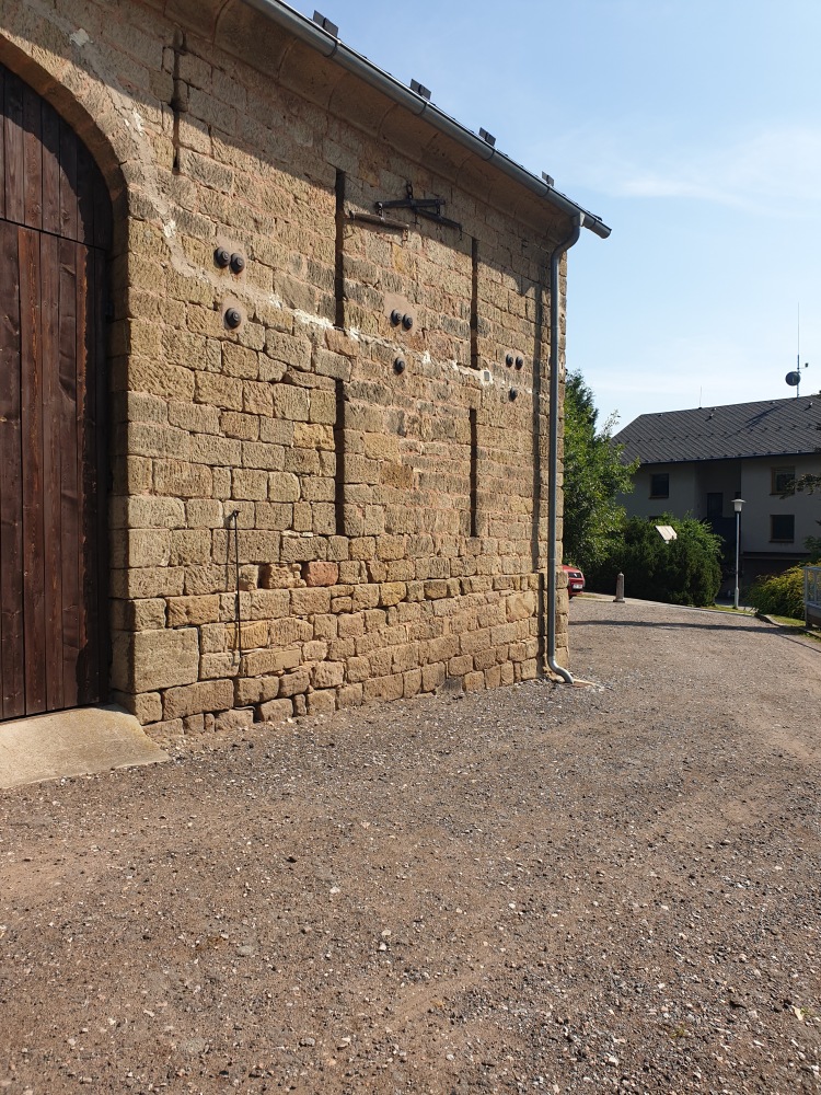 Řemenice na této zdi je pozůstatkem zařízení na výrobu elektřiny pro potřebu osvětlení zámeckých místností. K výrobě elektřiny se tehdy používal např. Edisonův stroj dynamoelektrický (sestrojený r.1881), který byl zdrojem stejnosměrného proudu (120 V) založený na principu strojů válcových. Na tomto místě v přístavku u stodoly byl ještě před r. 1910 umístěn vlastní stroj na výrobu elektřiny pro zámek hnaný stabilním spalovacím motorem. Přes řemenici byl stroj využíván také k mechanickému pohonu dalších hospodářských strojů umístěných ve stodole. (Do té doby poháněných dobytčí silou ze žentouru před stodolou?)