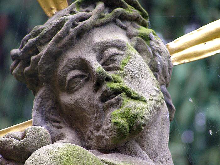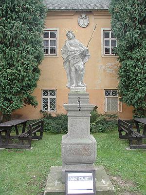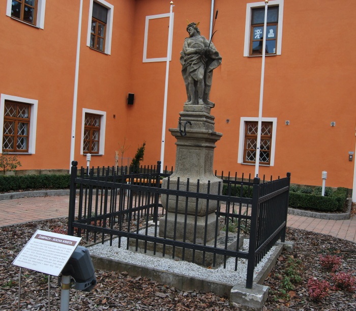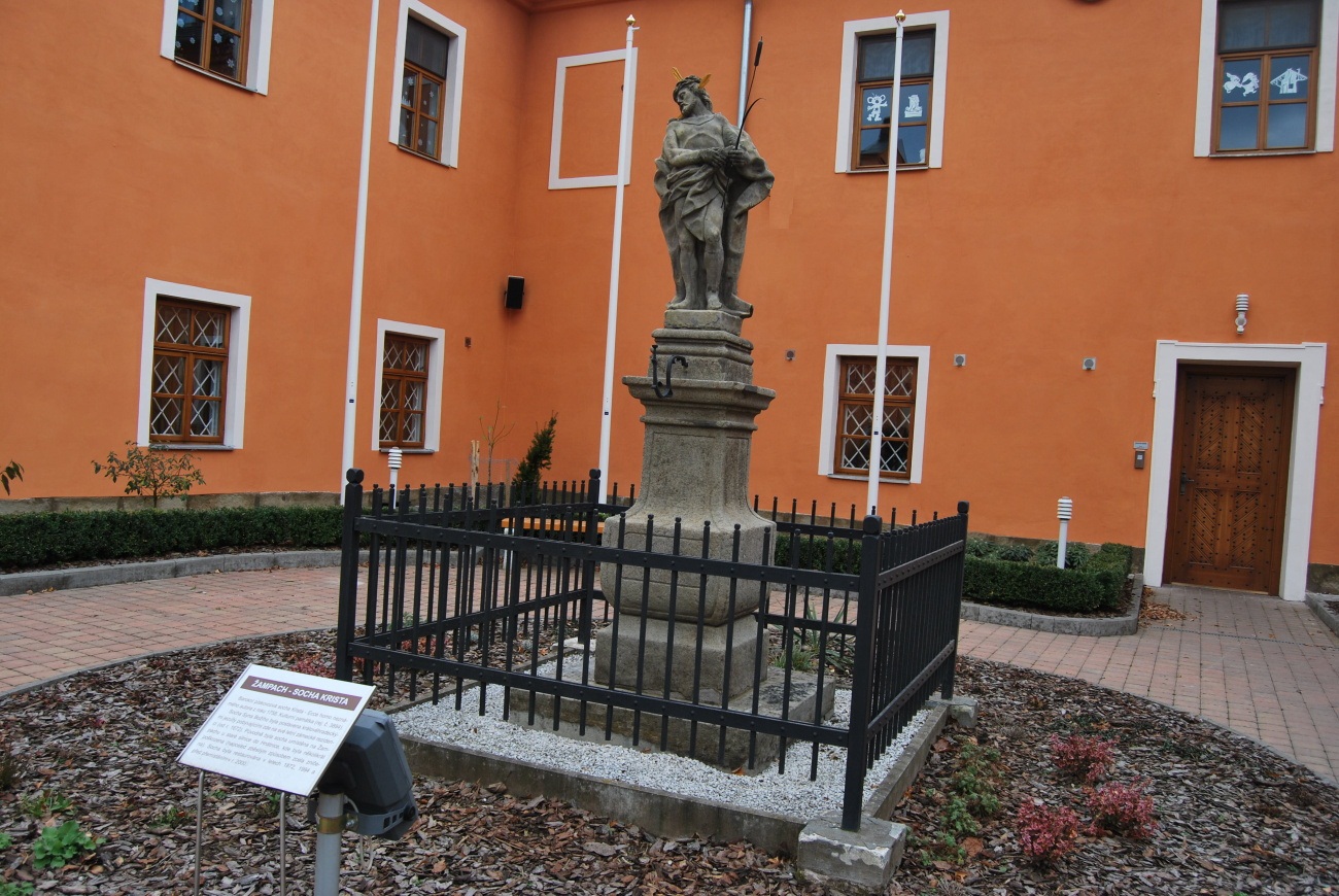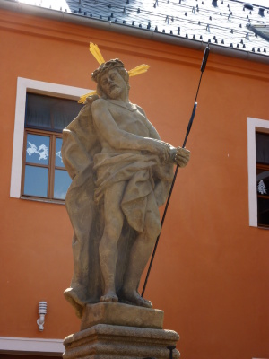 Barokní pískovcová socha Bolestného Krista - Ecce homo neznámého autora z roku 1758. Kulturní památka rej. č. 3894. Socha Syna Božího byla postavena královéhradeckými jezuity pobývajícími zde na své letní zámecké rezidenci (od r. 1672). Původně byla socha umístěna na Žampachu u staré silnice do Hnátnice, kde byla několikrát poškozena (naposled zběsilým způsobem zcela zničena). Socha byla restaurována v letech 1872, 1994 a před přemístěním v r. 2000. Z DOKUMENTACE RESTAURÁTORSKÝCH PRACÍ: Restaurování sochy v roce 2011 - 2012 - restaurátor ak. soch. Karel Krátký Restaurování sochy v roce 2000 - restaurátor ak. soch. Karel Krátký Restaurování sochy v roce 1994 - restaurátor ak.soch. Jan Vích, Ivan Nosek Archiv - fotodokumentace - restaurátorských prácí v r. 1994 a v r. 2000. Stav po restaurování v roce 2012