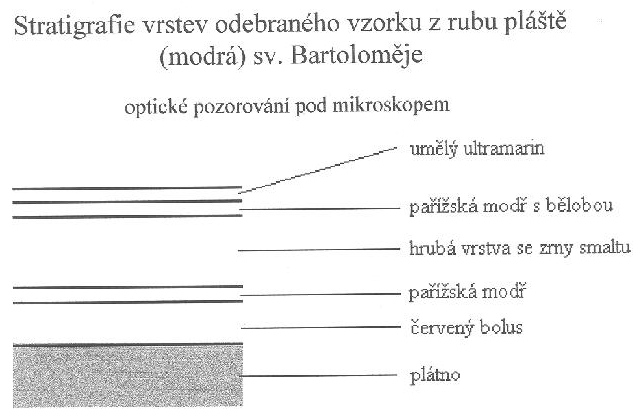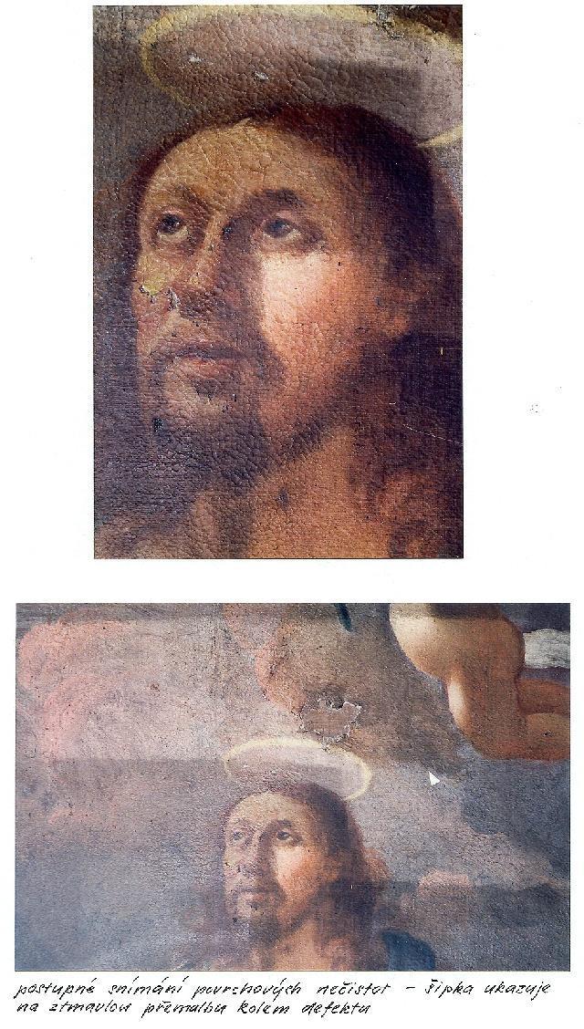 Při zevrubné prohlídce malby za použití binokulární lupy nebo pod UV lampou se určité partie jevily jako přemalby, které částečně šly přes některé krakely. Byla to svatozář a plocha uvnitř se dvěma defekty a hlavně modrá přes rub brokátového okrového pláště. Z té byl odebrán vzorek ke zjištění stratigrafie barevných vrstev / výsledek - viz příloha /. V ploše této modré se také nalézá jeden ze dvou nejstarších defektů z rubu vyspravených záplatami / viz polní náčrt rubu plátna/.
