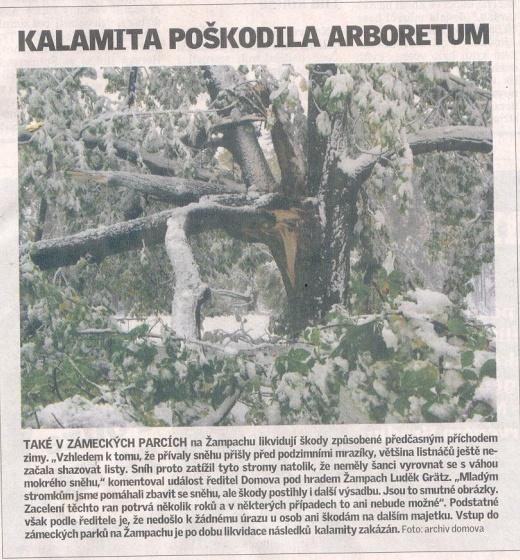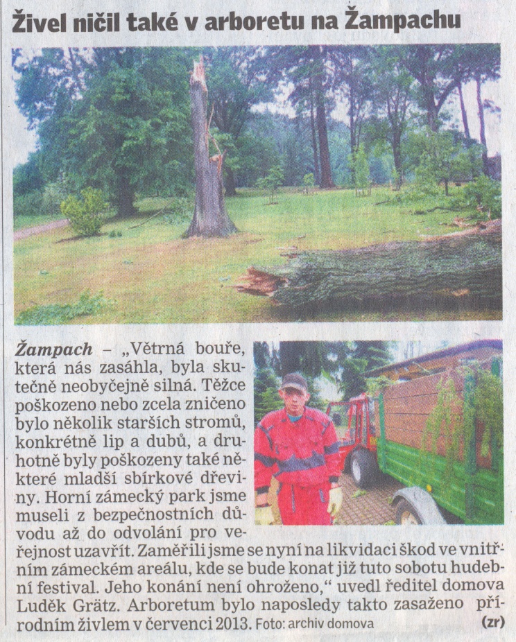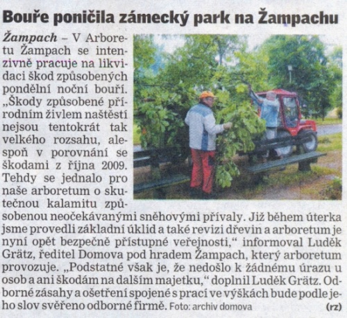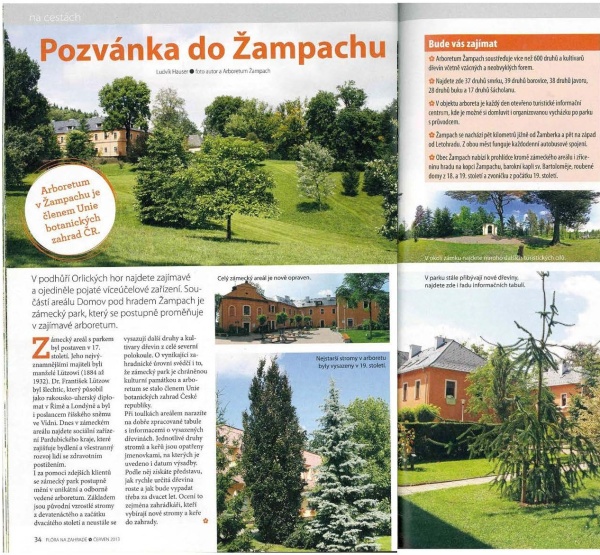 Rok 2013 29.07.2013 Také Arboretum Žampach bylo zasaženo silnou noční bouří, která napáchala škody v zámeckých parcích. Fotografie - Facebook - zde. Celá zpráva na www deníku - zde. článek o Arboretu Žampach v časopisu Flóra 2013 - jako soubor pdf Rok 2012 článek na www deníku - zde další fotografie na www deníku - zde Rok 2011 ZVUKOVÝ ZÁZNAM: Český rozhlas Pardubice - 15.6.2011 04:07 2,9 MB článek 1 na www deníku - zde Toulavá kamera v Arboretu Žampach Tisková zpráva na www deníku - zde Zpráva 2 na www deníku - zde Rok 2010 Arboreum se připravuje na zimu - článek na www deníku - zde Reportáž Českého rozhlasu - Arboretum Žampach