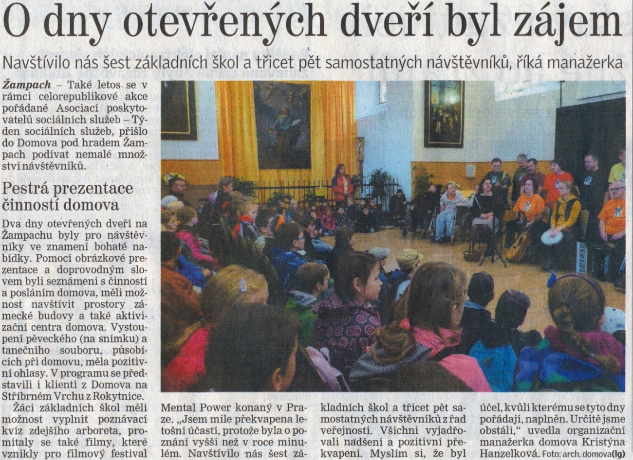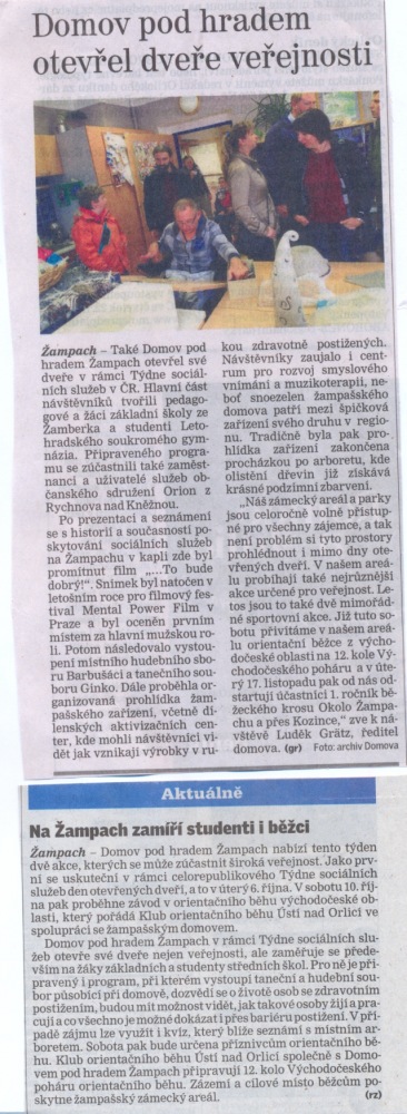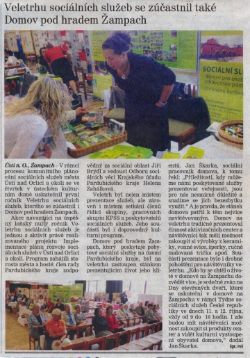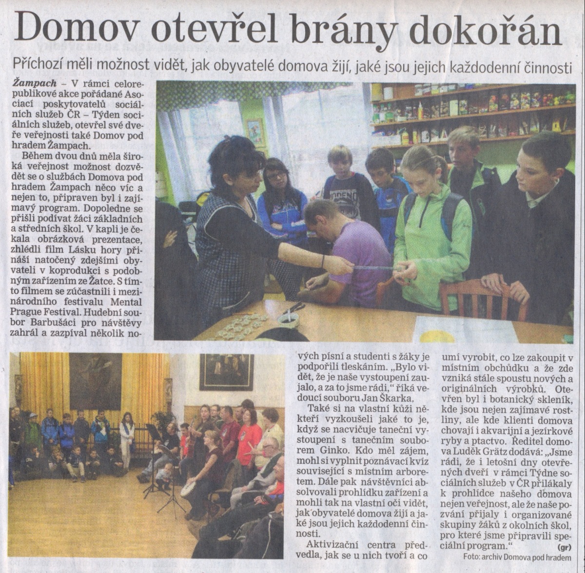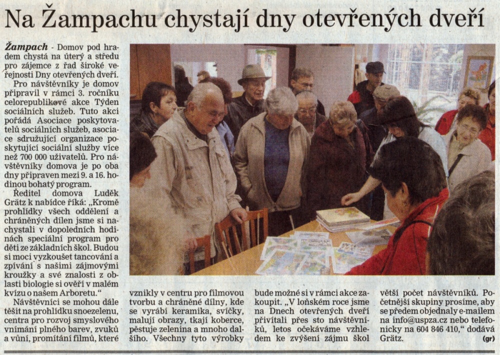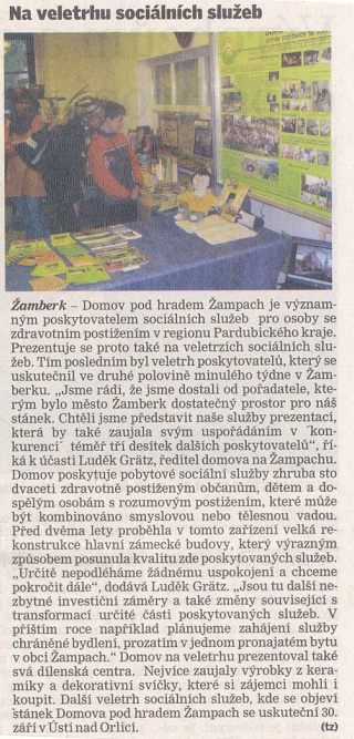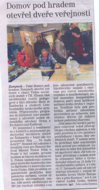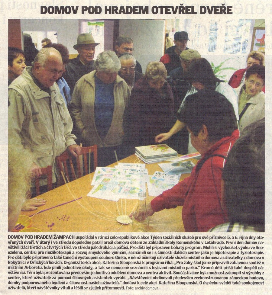 DNY OTEVŘENÝCH DVEŘÍ v Domovu pod hradem Žampach v rámci TÝDNE SOCIÁLNÍCH SLUŽEB ČR 5.-6.10.2010 tisková zpráva 1 - na www deníku tisková zpráva 2 - na www deníku Veletrh sociálních služeb Žamberk 9.9.2010 článek na www deníku - zde článek 2 - zde Svatební obřad - článek: srpen 2010 (článek na www deníku - zde) - srpen 2009 Prezentace domova ve dnech 31.3. a 1.4. 2010 při příležitosti Pedagogických dnů pořádaných Pedag. fakultou na Univerzitě v Hradci Králové. Společenská oslava 80. narozenin paní Zdeňky Sütterové, 17. února 2010 Tisková zpráva na www deníku KDO MILUJE, DARUJE KREV - 12. a 16. 2. 2010 - tato akce byla podpořena výrobky keramické dílny Domova pod hradem Žampach. Tisková zpráva 2010 - na www deníku - zde Tisková zpráva 2 - na www deníku - zde 2009