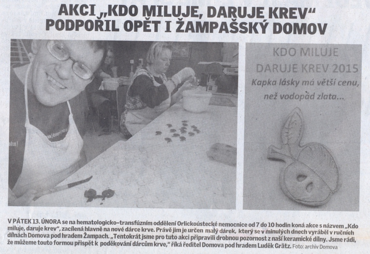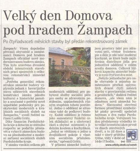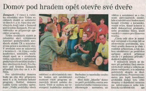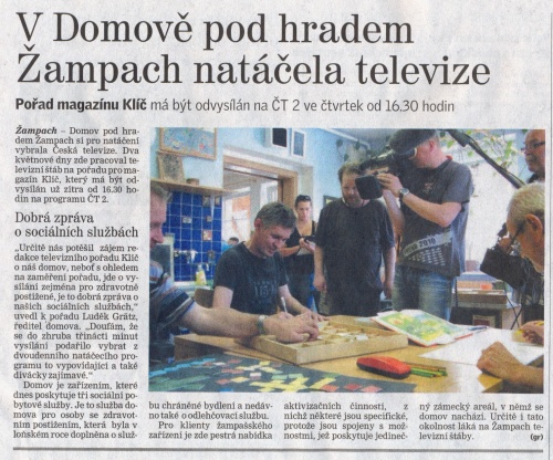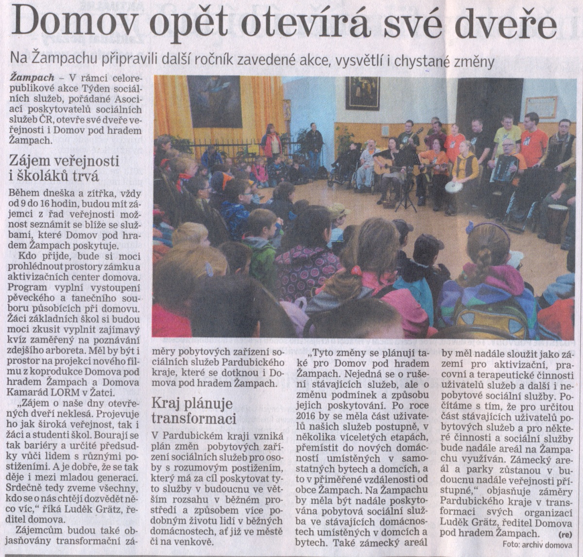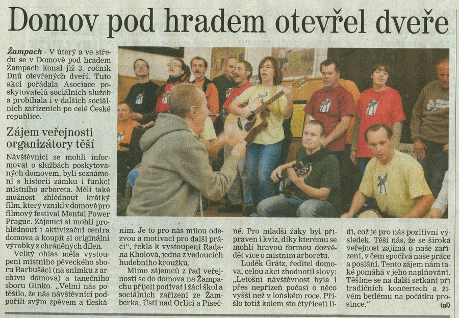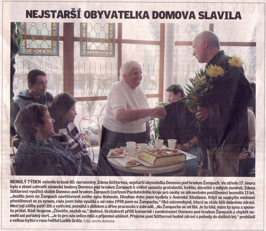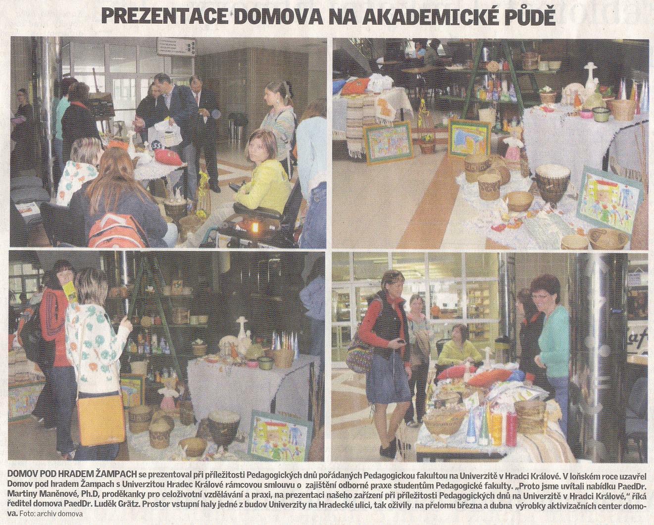 DNY OTEVŘENÝCH DVEŘÍ v Domovu pod hradem Žampach v rámci TÝDNE SOCIÁLNÍCH SLUŽEB ČR 5.-6.10.2010 tisková zpráva 1 - na www deníku tisková zpráva 2 - na www deníku Veletrh sociálních služeb Žamberk 9.9.2010 článek na www deníku - zde článek 2 - zde Svatební obřad - článek: srpen 2010 (článek na www deníku - zde) - srpen 2009 Prezentace domova ve dnech 31.3. a 1.4. 2010 při příležitosti Pedagogických dnů pořádaných Pedag. fakultou na Univerzitě v Hradci Králové. Společenská oslava 80. narozenin paní Zdeňky Sütterové, 17. února 2010 Tisková zpráva na www deníku KDO MILUJE, DARUJE KREV - 12. a 16. 2. 2010 - tato akce byla podpořena výrobky keramické dílny Domova pod hradem Žampach. Tisková zpráva 2010 - na www deníku - zde Tisková zpráva 2 - na www deníku - zde 2009