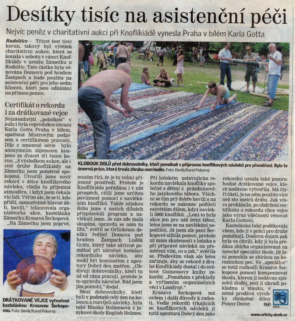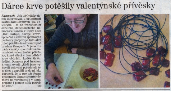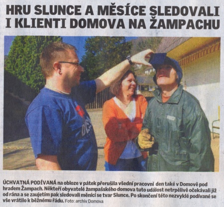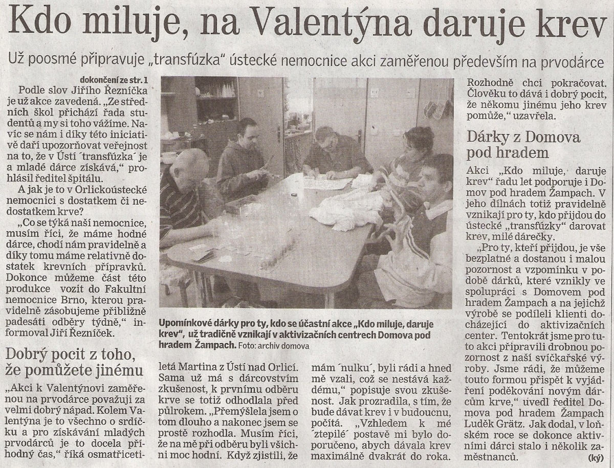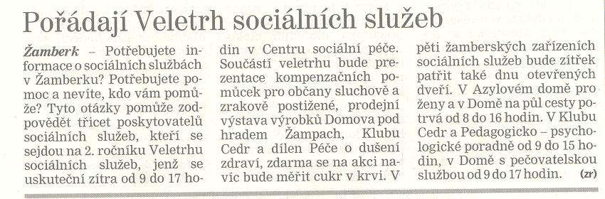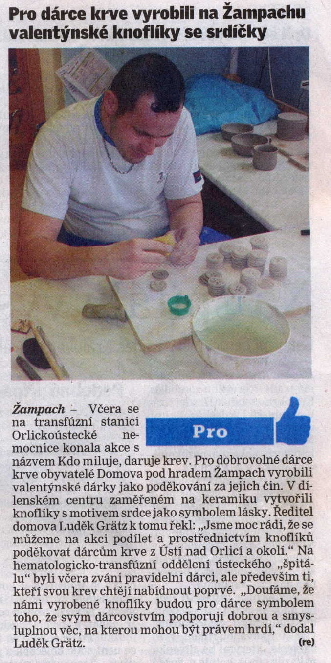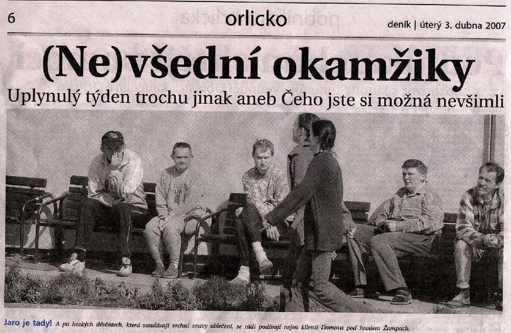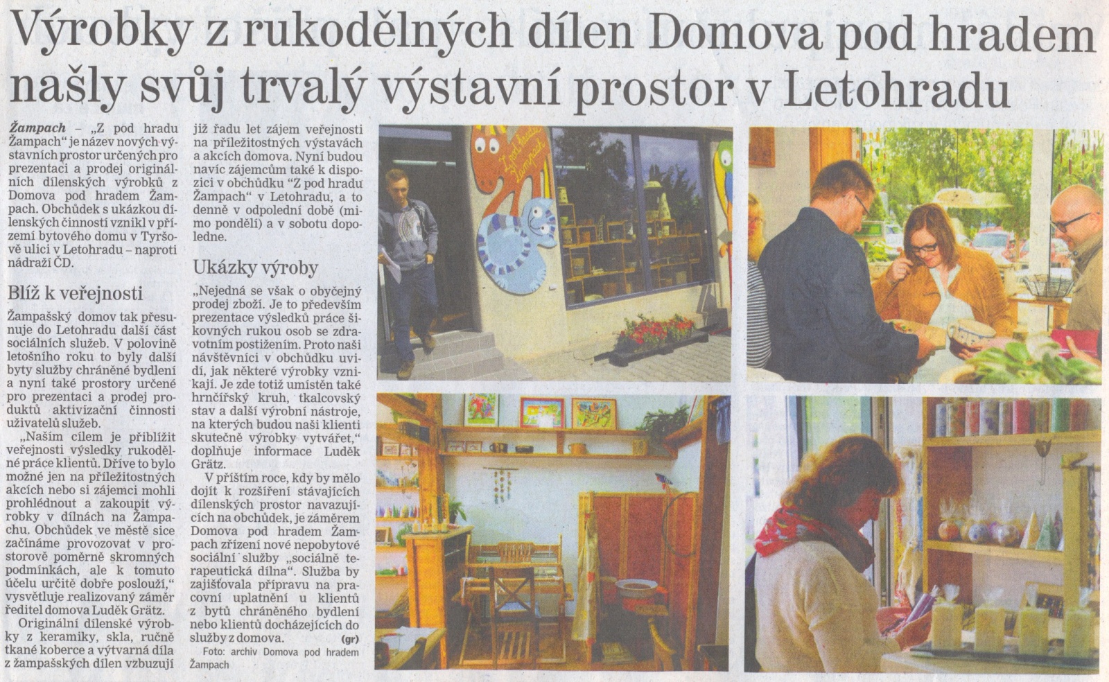 DNY OTEVŘENÝCH DVEŘÍ v Domovu pod hradem Žampach v rámci TÝDNE SOCIÁLNÍCH SLUŽEB ČR 5.-6.10.2010 tisková zpráva 1 - na www deníku tisková zpráva 2 - na www deníku Veletrh sociálních služeb Žamberk 9.9.2010 článek na www deníku - zde článek 2 - zde Svatební obřad - článek: srpen 2010 (článek na www deníku - zde) - srpen 2009 Prezentace domova ve dnech 31.3. a 1.4. 2010 při příležitosti Pedagogických dnů pořádaných Pedag. fakultou na Univerzitě v Hradci Králové. Společenská oslava 80. narozenin paní Zdeňky Sütterové, 17. února 2010 Tisková zpráva na www deníku KDO MILUJE, DARUJE KREV - 12. a 16. 2. 2010 - tato akce byla podpořena výrobky keramické dílny Domova pod hradem Žampach. Tisková zpráva 2010 - na www deníku - zde Tisková zpráva 2 - na www deníku - zde 2009