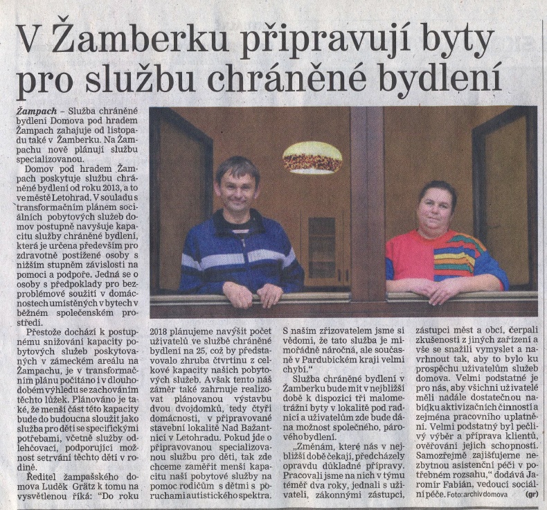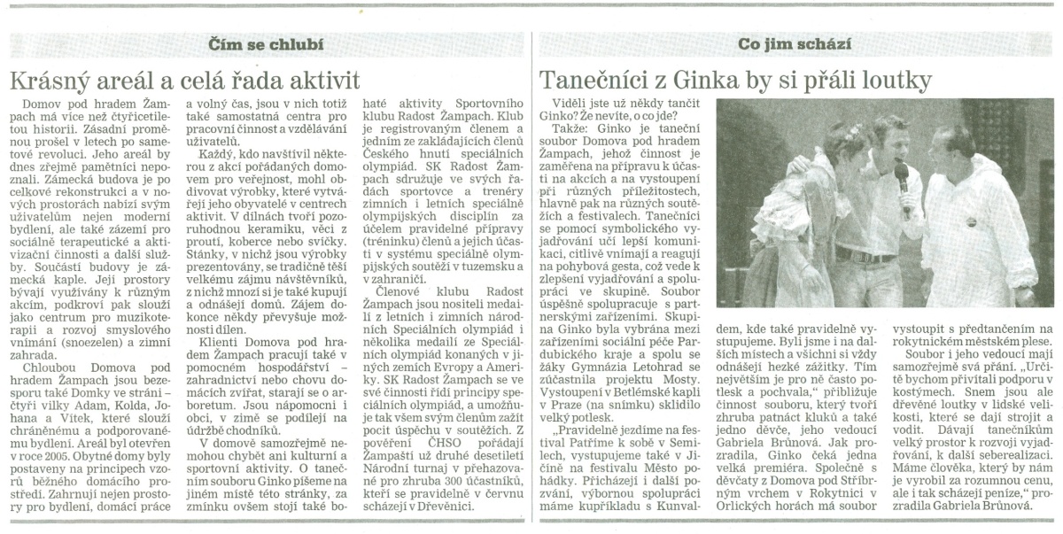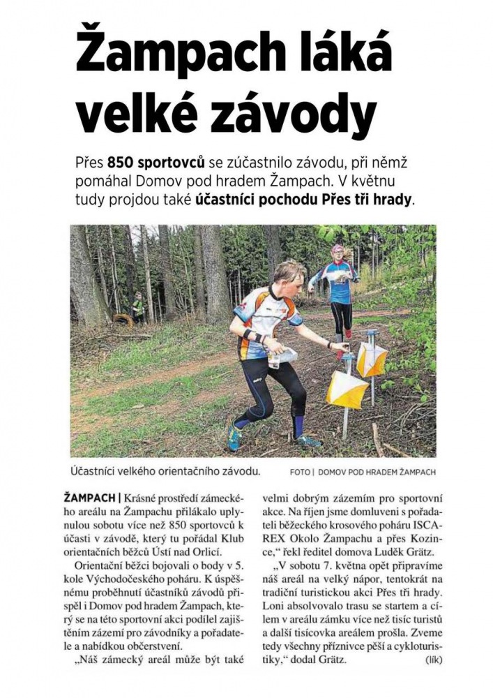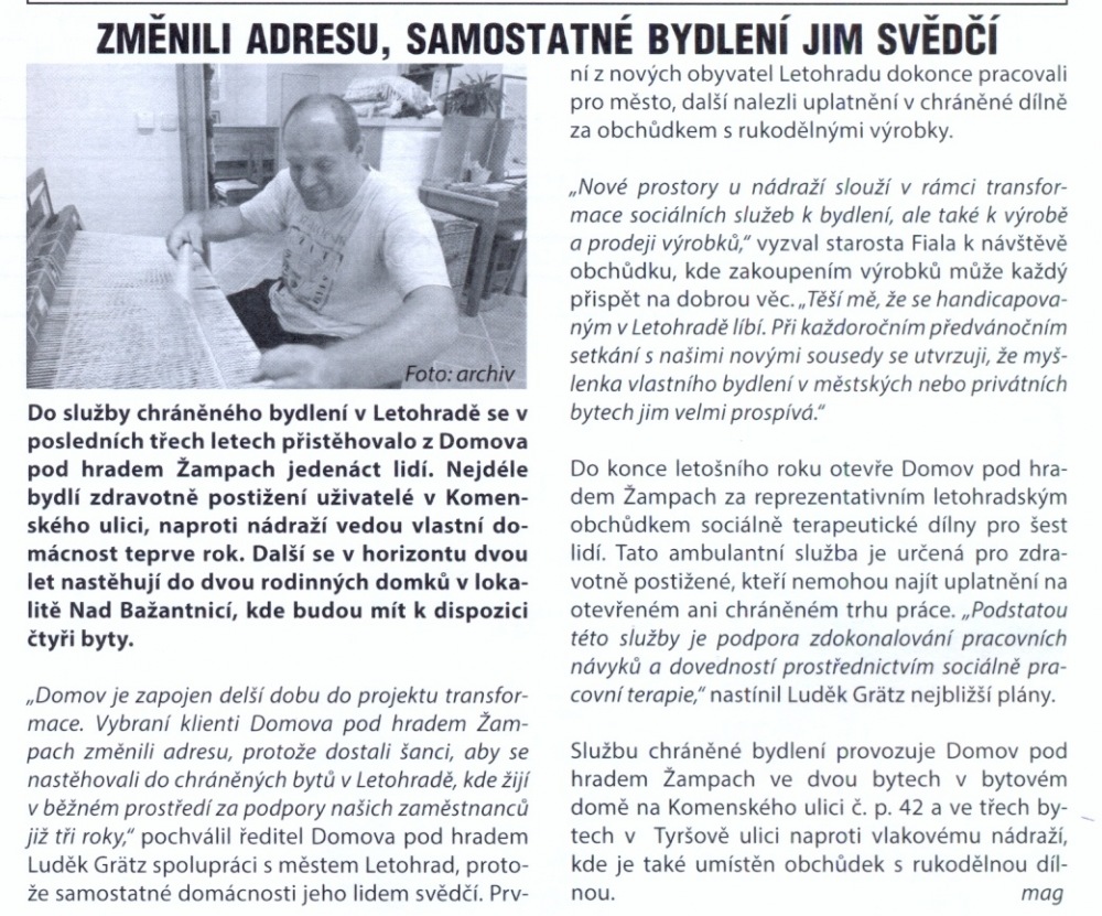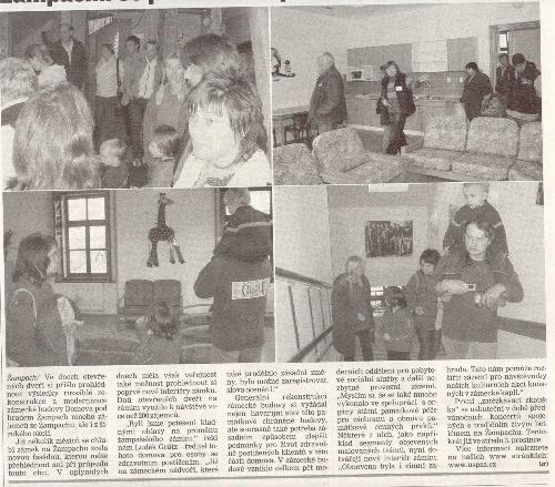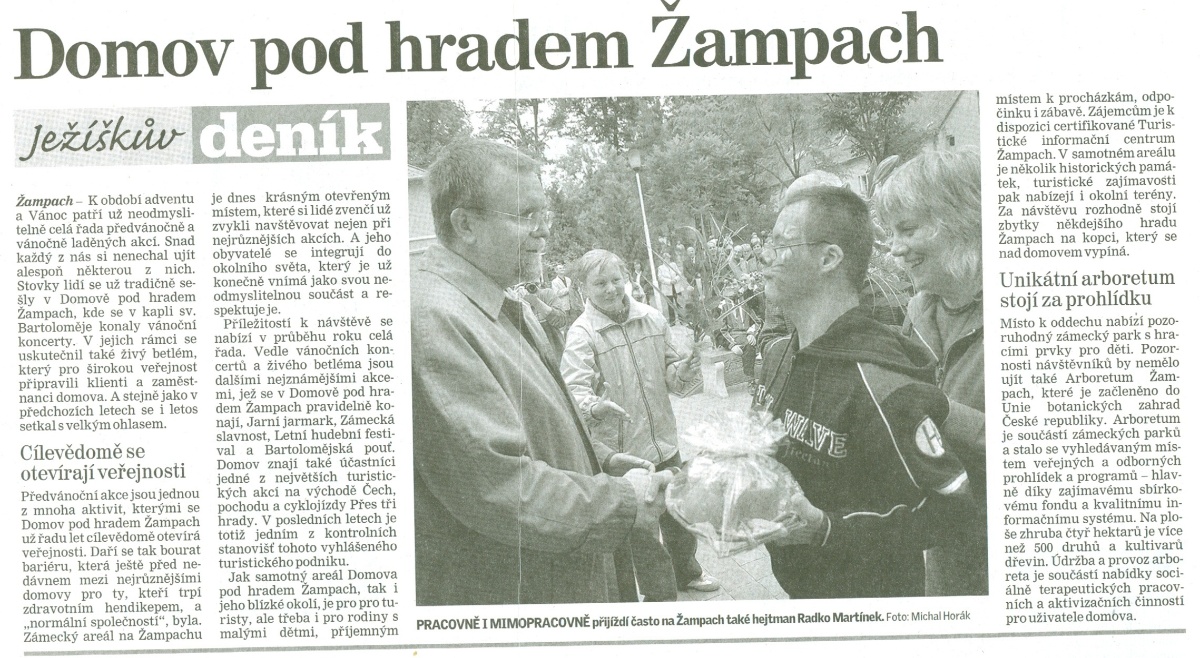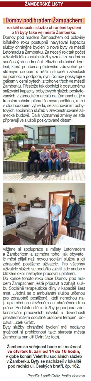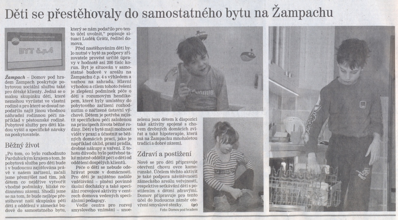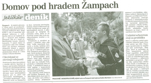 Žamberecké listy č. 13 - 2016 Letohradský zpravodaj č.8 - 2016 zpráva na www deníku 2016 - zde Rezidenční péče 06/2016 - Odborný časopis pro sociální péči VIDEO reportáž TV OIK - 16.04. 2016 Děti se přestěhovaly ze zámku do bytu v č.p. 4 zpráva na www zřizovatele zpráva na www deníku zpráva na www deníku 2015 - CHB Žamberk - zde tisková zpráva pořadatelů na www deníku článek KOB ÚO zpráva1 na www deníku - zde zpráva2 na www deníku - zde zpráva na www deníku - zde KONCERT A SEMINÁŘ hudebního umělce Iva Sedláčka se uskutečnil v kapli Domova pod hradem Žampach v pátek 6.2. a v sobotu 7.2. 2015. Informace: více >> článek na www deníku - zde 2014 Tisková zpráva 2 na www deníku Tisková zpráva 1 na www deníku Tisková zpráva na www deníku - zde. 2013 2012