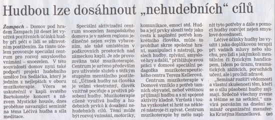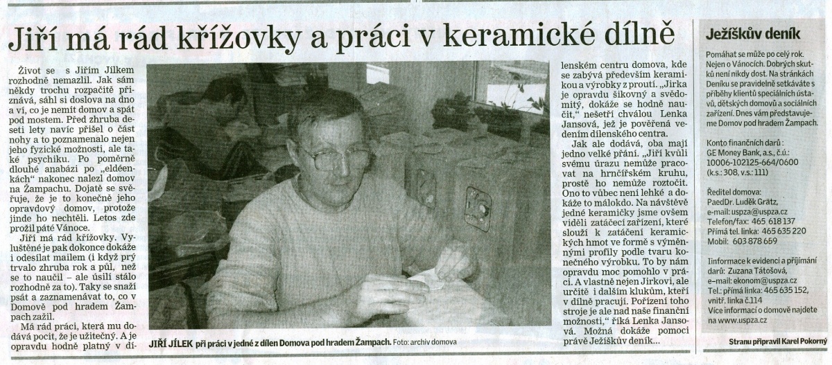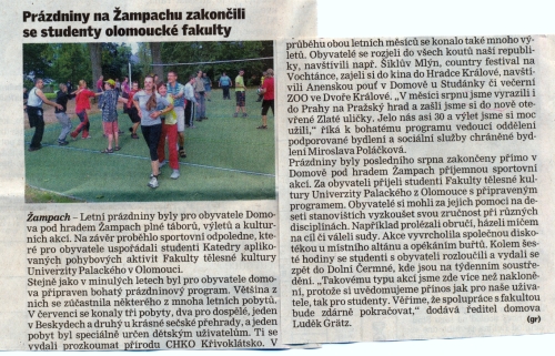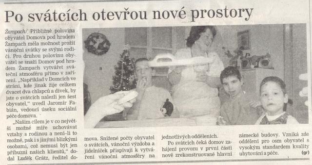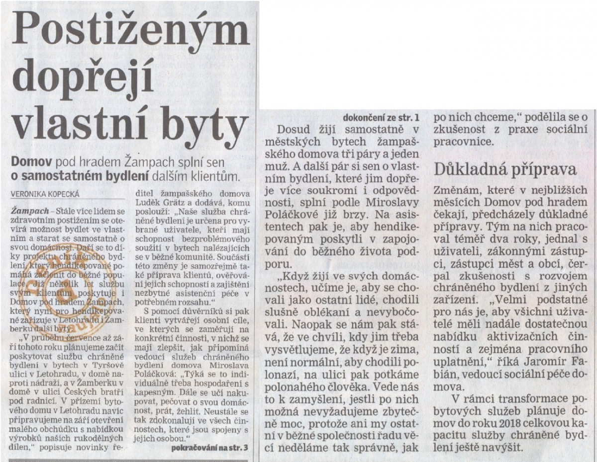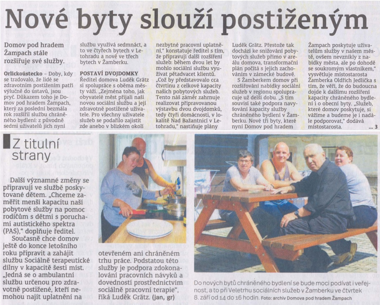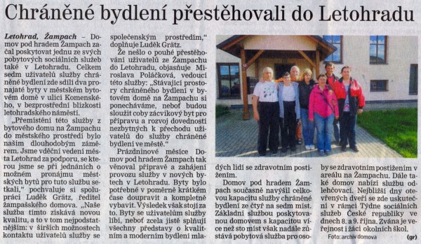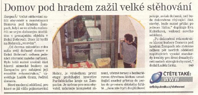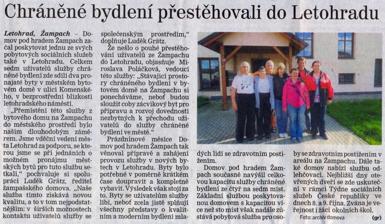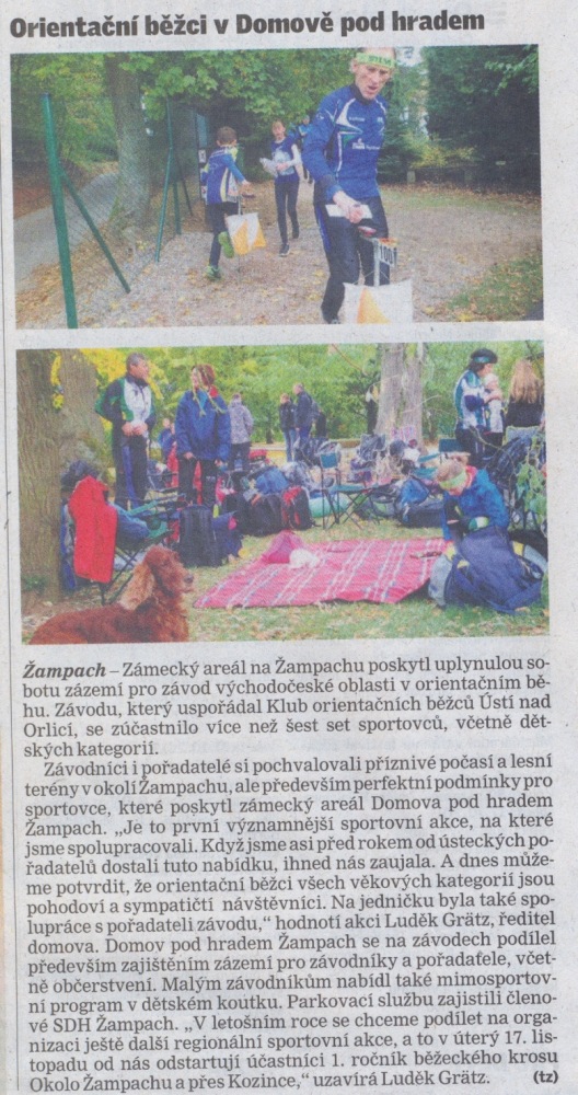 Žamberecké listy č. 13 - 2016 Letohradský zpravodaj č.8 - 2016 zpráva na www deníku 2016 - zde Rezidenční péče 06/2016 - Odborný časopis pro sociální péči VIDEO reportáž TV OIK - 16.04. 2016 Děti se přestěhovaly ze zámku do bytu v č.p. 4 zpráva na www zřizovatele zpráva na www deníku zpráva na www deníku 2015 - CHB Žamberk - zde tisková zpráva pořadatelů na www deníku článek KOB ÚO zpráva1 na www deníku - zde zpráva2 na www deníku - zde zpráva na www deníku - zde KONCERT A SEMINÁŘ hudebního umělce Iva Sedláčka se uskutečnil v kapli Domova pod hradem Žampach v pátek 6.2. a v sobotu 7.2. 2015. Informace: více >> článek na www deníku - zde 2014 Tisková zpráva 2 na www deníku Tisková zpráva 1 na www deníku Tisková zpráva na www deníku - zde. 2013 2012