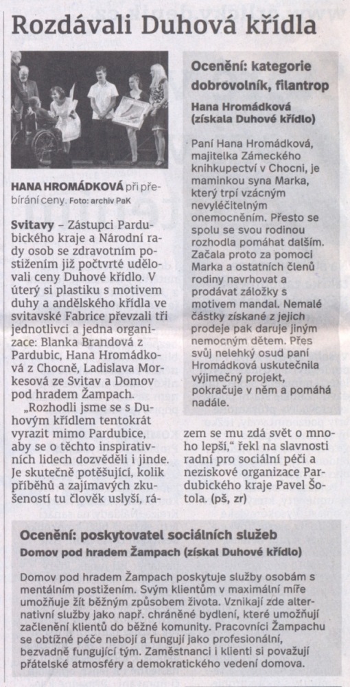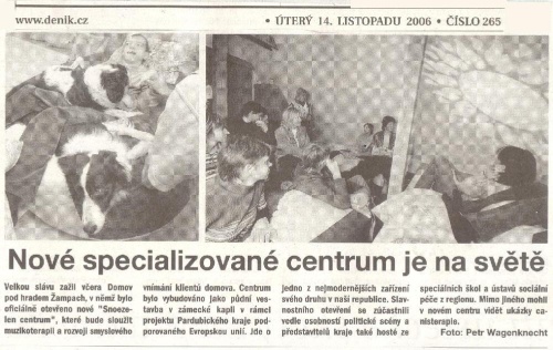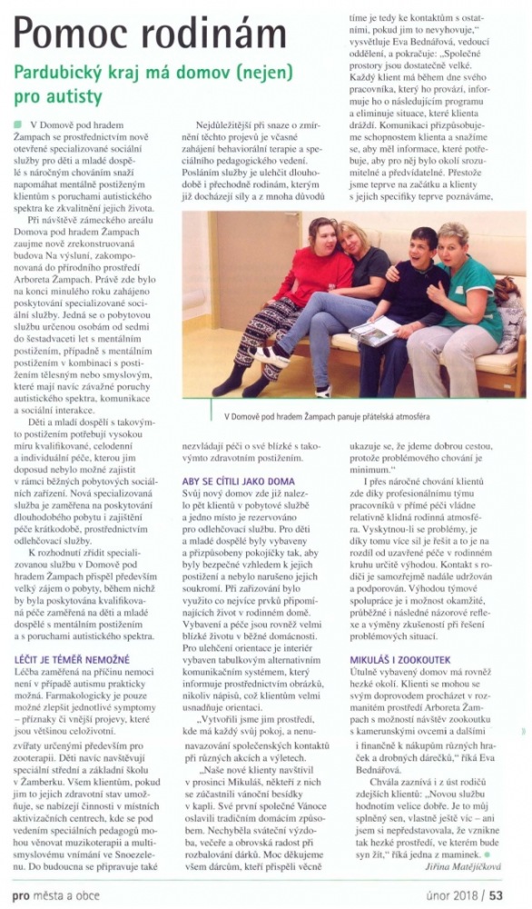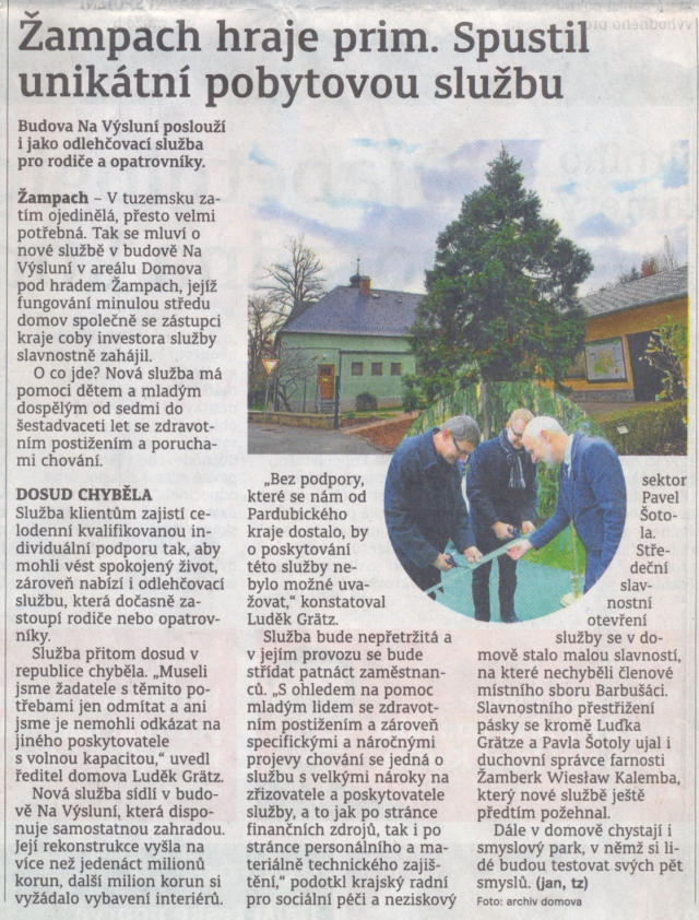 2017 15.11. 2017 - SPECIALIZOVANÁ SLUŽBA BYLA OFICIÁLNĚ ZAHÁJENA Malou slavností bylo v areálu Domova pod hradem Žampach oficiálně zahájeno poskytování specializované pobytové sociální služby pro děti a mladé dospělé s náročným chováním. V nově zrekonstruované budově Na Výsluní je nyní poskytována celodenní individuální a odborná podpora celkem 6 uživatelům této služby, vč. služby odlehčovací. Pardubický kraj je tak nyní jedním z mála krajů v České republice, který provozuje pobytové sociální zařízení určené osoby s rozumovým postižením spojené s problémy v důsledku poruch autistického spektra. Tisková zpráva www Pardubický Kraj - zde. Zpráva na www deníku. Smyslový pak - smyslová stezka Tisková zpráva na www deníku - zde Více fotografií ze slavnostního zahájení specializované služby - galerie Tisková zpráva Duhové křídlo a Tomáš Rybička na www deníku Tomáš Rybička převzal z rukou radního Pardubického kraje Pavla Šotoly mimořádné ocenění při udílení cen Duhové křídlo 2017.