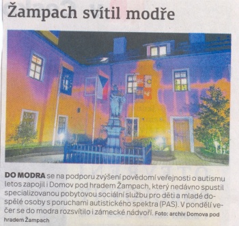 Smyslový park a český dvorek - zooterapie v Domovu pod hradem Žampach: 2018 Světový den na podporu povědomí o autismu - za účasti Domova pod hradem Žampach Tisková zpráva na www deníku - zde
