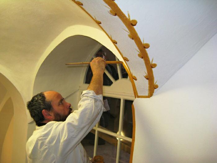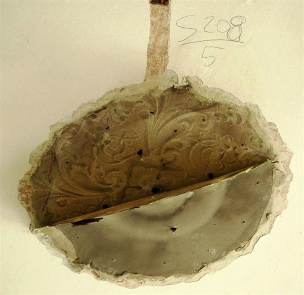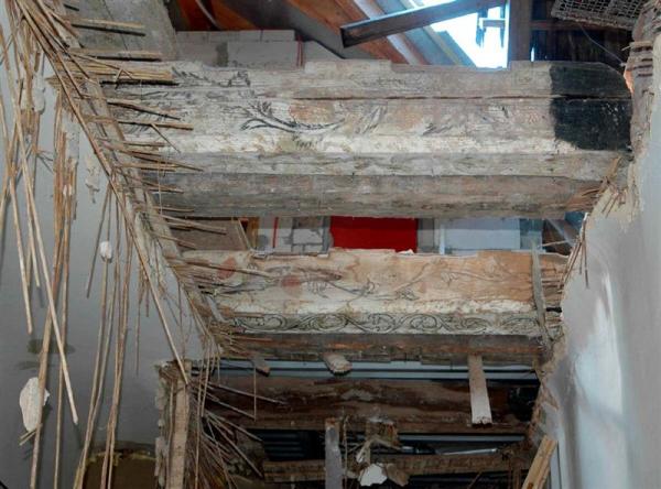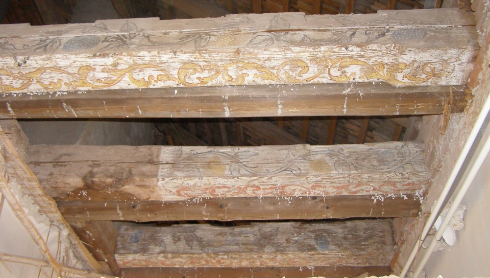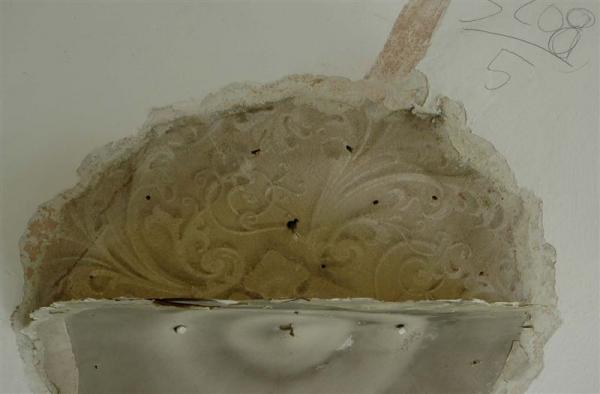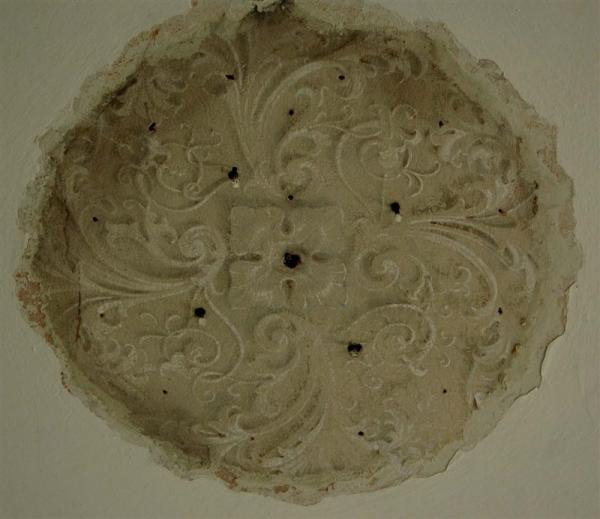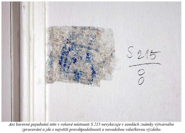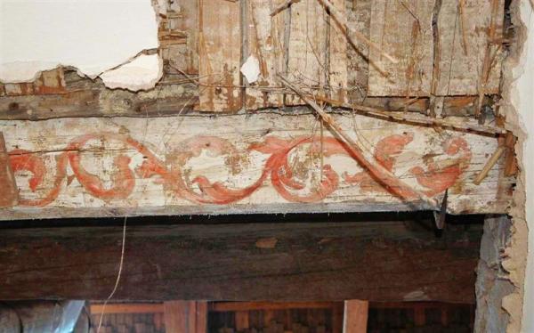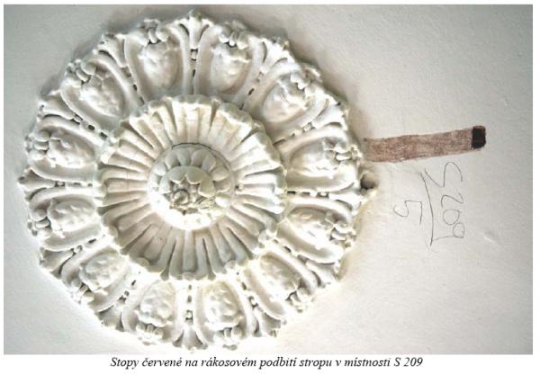 From: Šárka a Petr Bergerovi, akad. malíři a restaurátoři z textu zprávy: 1/ v odhalených průhledech stropu na chodbě v prvním patře jsou vidět malované trámy. .....jedná o poměrně starou a vzácnou památku (až přelom 17.-18.stol.)........ 2/ v rohové místnosti č.208 byla objevena pod sejmutým štukovým reliefem malovaná růžice ...... jedná se patrně o původní výzdobu stropu (možná přelom 18.-19.stol) , kde byl upevněn lustr - a v další stavební etapě byl tento náběh vytvořen štukem......