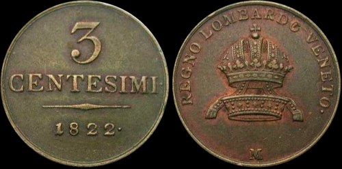 5 centesimů, Lombardo benátské království, 1822, mincovna Milán