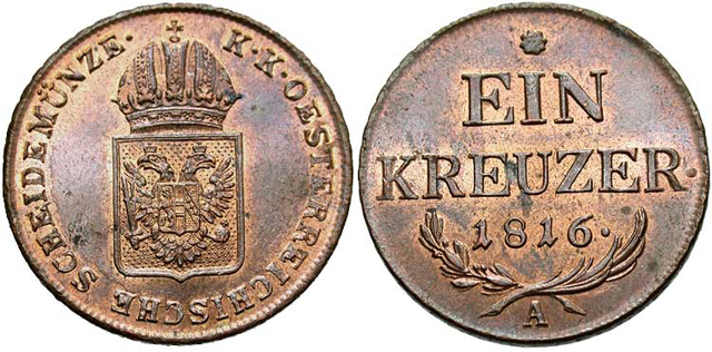B: nápis: EIN / KREUZER / 1816, dole dvě snítky vavřínu, pod nimi S