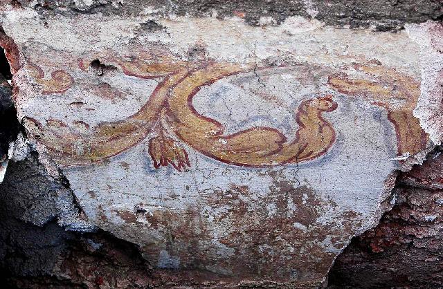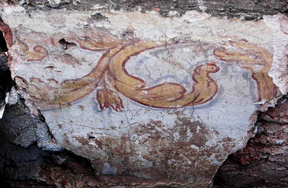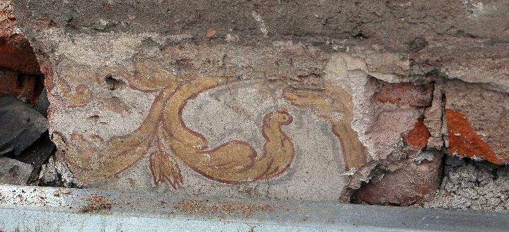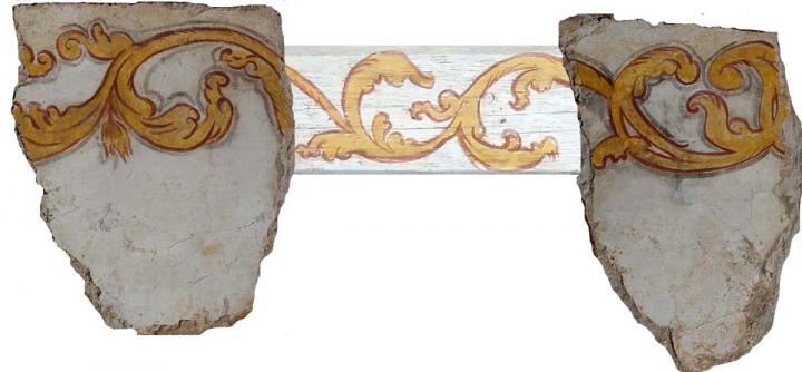 Zpět na hlavní článek - zámecká budova Z dokumentace záchranného průzkumu: fragment malovaného vlysu pod stropem (konec 17. století) před sejmutím Šárka a Petr Bergerovi, akad. malíři a restaurátoři |
