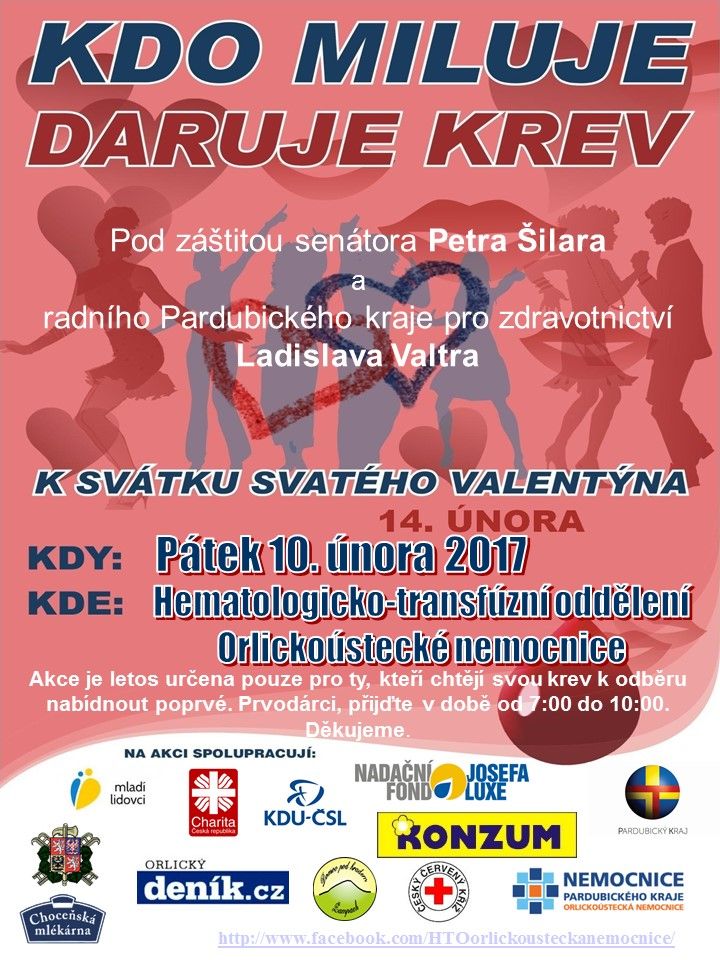 Z tiskové zprávy r. 2009: zpráva na www deníku - zde Na orlickoústecku měla akce "Kdo miluje, daruje krev" velký úspěch v Ústí nad Orlicí. U příležitosti svátku Sv. Valentina se ve dnech 10. a 13. února 2009 v Hematologicko-transfúzním oddělení Orlickoústecké nemocnice a.s. konala dobrovolnická akce "Kdo miluje, daruje krev".