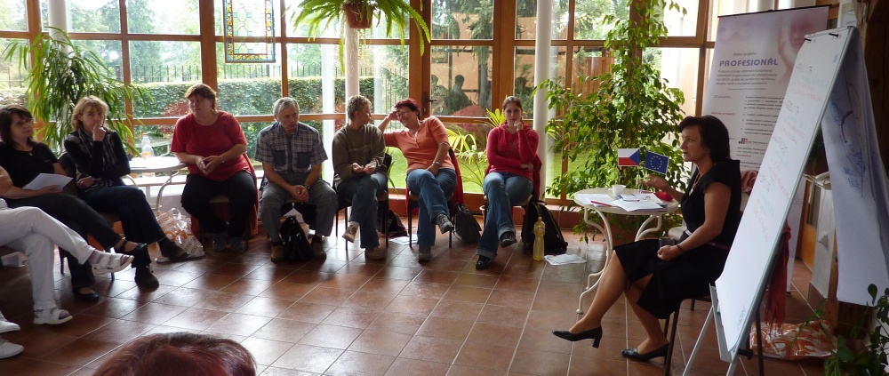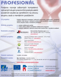 Cílem projektu je zvýšení úrovně kvality soc.služeb poskytovaných lidem s mentálním postižením v Pardubickém kraji.Cíle bude dosaženo prostřednictvím odborného vzdělávání vybraných skupin pracovníků poskytovatelů soc. služeb, tj.pracovníků v soc.s lužbách (PSS) a vedoucích pracovníků (VP). Do realizace projektu budou zapojeny 2 akredit. vzdělávací instituce a 4 domovy pro osoby se zdrav. postižením (realizátor + 5 partnerů). Z fotodokumentace realizace projektu: Z projednávání partnerské smlouvy v 06-2010 Z průběhu školení v 10-2010
