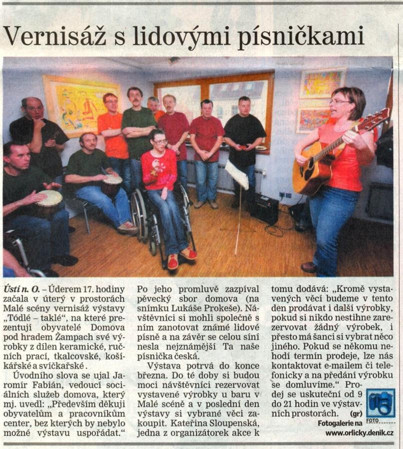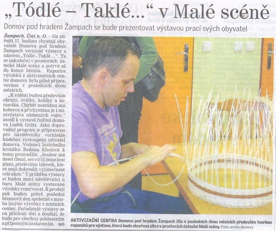 :: Centra aktivit – dílny – keramika, proutí,.... :: Todlé - taklé... VÝSTAVA VÝROBKŮ dílenských center domova v Malé scéně v Ústí nad Orlicí Vernisáž 1.3. 2011. Výstava byla otevřena do 30.3.2011, prodej rezervovaných výrobků 30.3. 2011. článek1 na www deníku - zde článek 2 na www deníku - zde článek na www města Ústí n.Orl. článek1 - výstřižek článek2- výstřižek Článek na www TV OIK - zde Fotografie z přípravy výrobků na výstavu