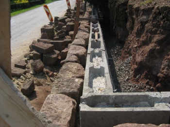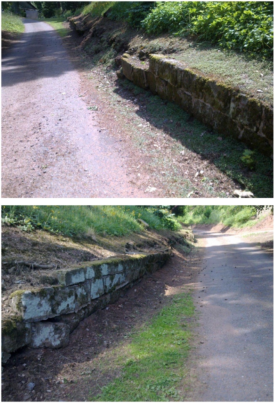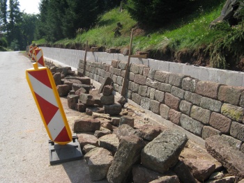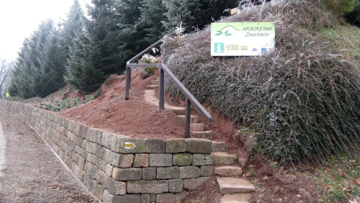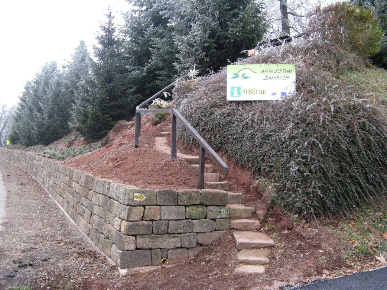 :: NA ÚVOD - O ARBORETU : Z projektové dokumentace : příloha 1, příloha 2, příloha 4 V roce 2011 se uskutečnila generální oprava opěrné pískovcové u horního zámeckého parku, a to havarijní úsek u silnice a pod lávkou. Nově bude také upraven přístup k vyhlídce po pískovcovém schodišti od silnice. Čertovy kameny v Arboretu Žampach 25.11.2011 - po dokončení stavebních prací a sadových úprav novinový článek - zde článek na www deníku - zde Z fotodokumentace průběhu stavebních prací: havarijní stav zdi před rekonstrukcí
