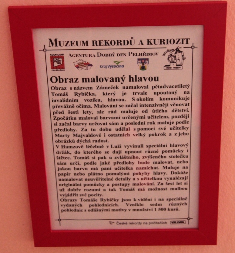 Větrný mlýn v obci Vrátno Nový zámek u Lanškrouna Poušť Rybička pro PF 2013 kaple sv. Jana Nepomuckého Letohrad - obrázek s předlohou symbolický šek na úhrnnou částku finanční pomoci 202.227,- Kč Reportáž - regionál. TV - OIK - zde tisková zpráva z akce 7.7. 2012 - na www deníku - zde tisková zpráva z akce 7.7. 2012 - jako soubor pdf - zde Muzeum rekordů a kuriozit Pelhřimov spravované agenturou Dobrý den Pelhřimov Expozice Tomáše Rybičky v muzeu Pelhřimov (informace - zde) Více fotografií - facebook - zde. V roce 2012 byla zřízena malá expozice Tomáše Rybičky v muzeu Pelhřimov - více o tomto projektu zde. Článek 1 v deníku Blesk 5.11.2012 - zde magazín TOP FORUM jaro 2013 - zde