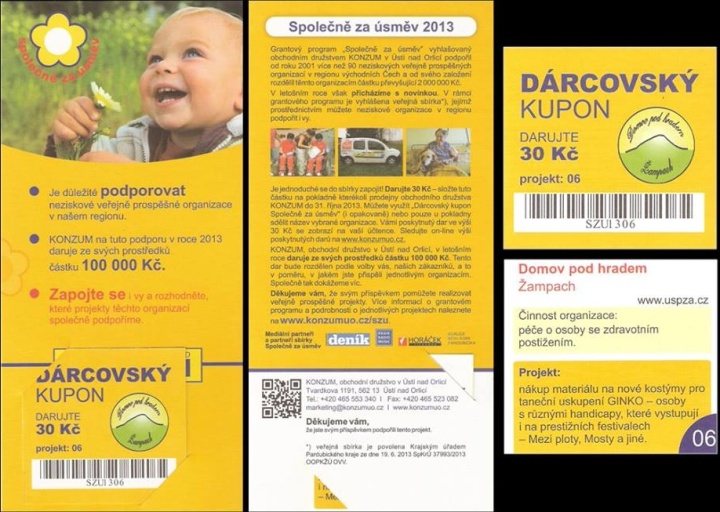 Domů už Vám určitě v letáku přišly kódy všech organizací, které žádají o finanční podporu. Nyní je i možnost získat Dárcovský kupon na dalších místech (přímo v domově na Žampachu, Konzum Písečná a Žampach). Pokud se rozhodnete přispět, necháte si daný Dárcovský kupón v prodejnách Konzumu načíst a zaplatíte ho jako každé jiné zboží (30,-Kč / kupon). Čím více kupónů se načte, tím více procent z částky 100 000 Kč získáme pro náš domov a za tuto částku se pořídí nové kostýmy pro náš taneční soubor GINKO.