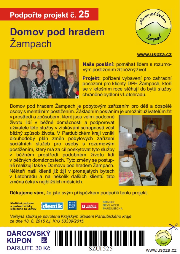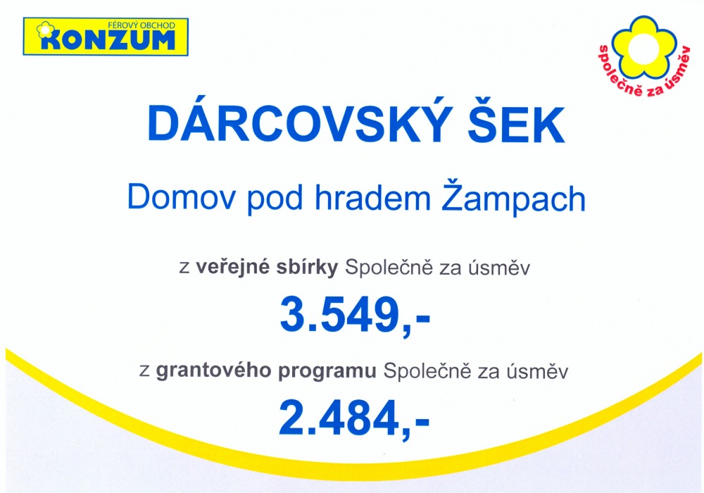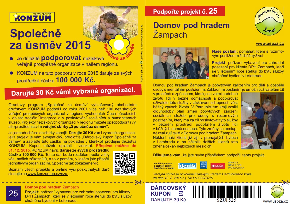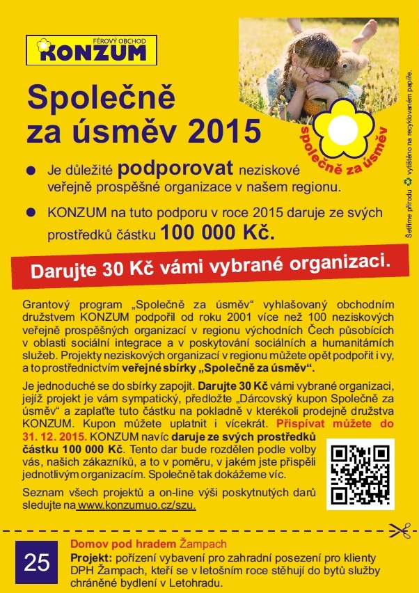 Veřejná sbírka společnosti KONZUM 2015 byla vyhlášena také pro Domov pod hradem Žampach. Děkujeme Vám za podporu našeho projektu č. 25. Finanční prostředky ze sbírky použijeme na zakoupení vybavení pro zahradní posezení pro klienty našeho domova, kteří se v letošním roce stěhují do bytů služby chráněné bydlení v Letohradu. Děkujeme za Vaši podporu ! Fotografie zakoupeného vybavení: Dárcovské kupony lze získat v obchodech KONZUM nebo přímo v domově na Žampachu. Kopony si lze také vytisknout z našeho odkazu - zde. Pokud se rozhodnete přispět, necháte si daný Dárcovský kupón v prodejnách skupiny COOP - Konzum načíst a zaplatíte ho jako každé jiné zboží (30,-Kč / kupon). Dárcovské kupony lze uplatnit u pokladen všech obchodů skupiny COOP: Konzum, Coop Diskont, Fortel, Konzum Market,... a to nejen v našem regionu. Prodejny skupiny COOP. Více podrobností o sbírce na stránkách vyhlašovatele sbírky zde: http://www.konzumuo.cz/spolecne-za-usmev/