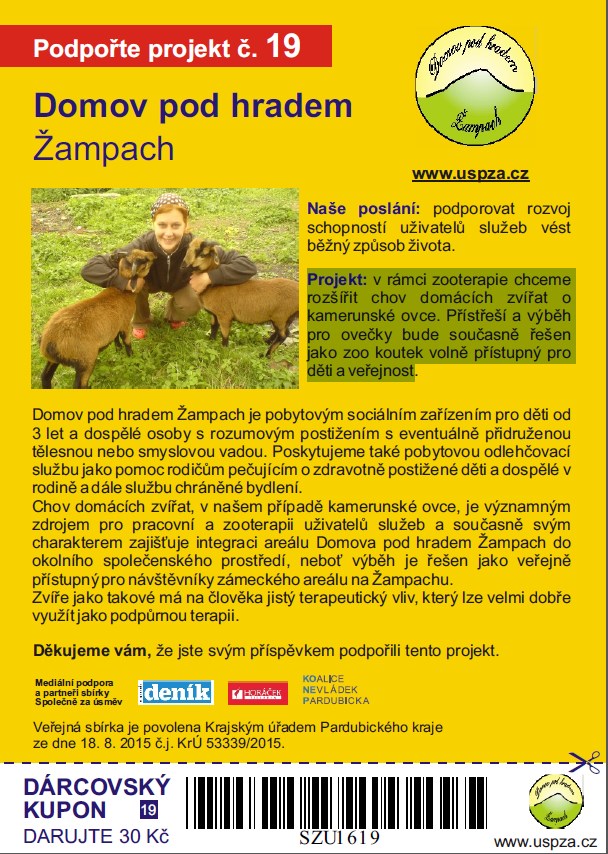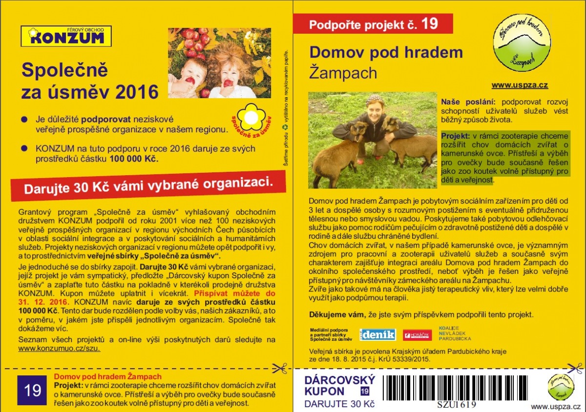 Veřejná sbírka společnosti KONZUM 2016 byla ukončena 31.12. 2016. Děkujeme Vám za podporu našeho projektu č. 19. Finanční prostředky ze sbírky použijeme rozšíření chovu domácích zvířat o ovce kamerunské. Přístřeší a výběh pro ovečky bude sloužit pro zooterapii uživatelů našich služeb a současně také jako zoo koutek volně přístupný pro ostatní děti a veřejnost. Děkujeme za Vaši podporu ! ZDE VÁS BUDEME INFORMOVAT O VÝSLEDKU SBÍRKY A VYUŽITÍ FINANČNÍ ČÁSTKY: Domov pod hradem Žampach získal z této sbírky částku v úhrnu: 9.375,- Kč (5.481,- z daru společnosti KONZUM a 3.894,- z vlastní sbírky od jednotlivých zákazníků) D ě k u j e m e ! V březnu 2017 jsme zahájili chov oveček v areálu našeho domova. Fotografie - březen 2017: Z fotodokumentace realizace našeho projektu: Z návštěvy u chovatele od kterého obdržíme ovečky pro náš chov Fotografie z dokončení stavby chlívku s výběhem - prosinec 2016 - více fotografií - zde. Dárcovské kupony lze získat v obchodech KONZUM nebo přímo v domově na Žampachu. Kopony si lze také vytisknout z našeho odkazu - zde. Pokud se rozhodnete přispět, necháte si daný Dárcovský kupón v prodejnách skupiny COOP - Konzum načíst a zaplatíte ho jako každé jiné zboží (30,-Kč / kupon). Přispívat bylo možno 31. 12. 2016 - sbírka uzavřena. Dárcovské kupony lze uplatnit u pokladen všech obchodů skupiny COOP: Konzum, Coop Diskont, Fortel, Konzum Market,... a to nejen v našem regionu. Prodejny skupiny COOP. Více podrobností o sbírce na stránkách vyhlašovatele sbírky zde: http://www.konzumuo.cz/spolecne-za-usmev/