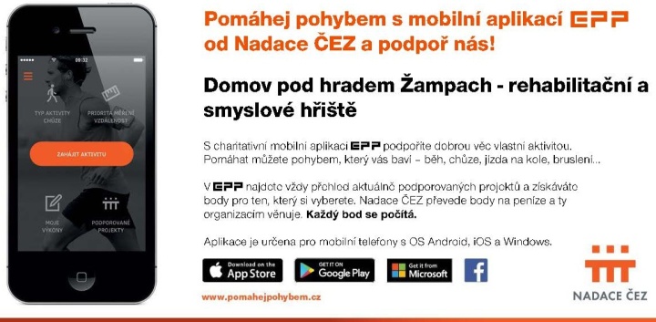 Informace o možnostech finančních darů pro tento účel: Příspěvek prostřednictvím Nadace ČEZ - mobilní aplikace EPP "Pomáhej pohybem": Pomáhejte pohybe s mobilní aplikací Nadace ČEZ - základní informace: S aplikací EPP pomáháte pohybem, který vás baví, vybírat můžete z mnoha aktivit (běh, chůze, jízda na kole, běžkování...) Aplikace zaznamenává váš pohyb a kromě běžných údajů o rychlosti či vzdálenosti také generuje body. Ty můžete kdykoli věnovat některému z aktuálně nabízených projektů neziskových organizací, škol nebo obcí. Po dosažení potřebného počtu bodů Nadace ČEZ projekt podpoří konkrétní dopředu stanovenou částkou. Maximální možná výše podpořené částky projektu je 100 000 Kč, čím více bodů získá náš projekt, tím vyšší možná dosažená částka. Termín realizace projektu: 1-12/2017. Slavnostní otevření hřiště: jaro 2018 Informace na www nadace: www.pomahejpohybem.cz Informace k mobilní aplikaci EEP Nadace ČEZ: Aplikace EPP je určena pro „chytré“ telefony Android, iOS i Windows a je ke stažení zdarma. Aplikace může fungovat i jako klasický sport tracker. Generuje také statistiky osobních výkonů tříděné po dnech, typech pohybu atd. Stažení aplikace, její používání i generování bodů je zdarma, k jejímu používání není nutné datové připojení - to vyžaduje aplikace pouze v případě, kdy chce uživatel přiřadit získané body některému z aktuálně nabízených projektů nebo k načtení stránky s novinkami. Aplikace je optimalizována pro mobilní telefony s operačními systémy Apple iOS od verze 7, Android od verze 4.0 a Windows Phone od verze 8.1.