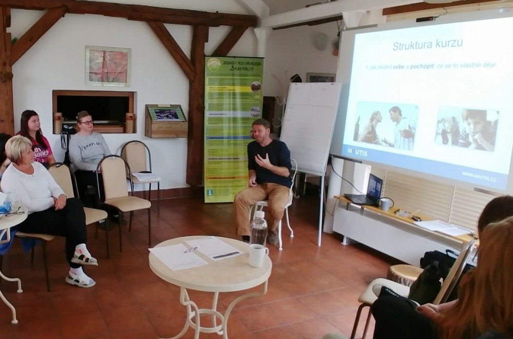 Z fotodokumentace realizace projektu Operační program Zaměstnanost (OPZ) Podpora implementace transformačního plánu a praktické realizace transformačního procesu Domova pod hradem Žampach - 2018 -2021 Fotografie z odborného vzdělávání zaměstnanců, lektor PhDr. Hynek Jůn, Ph.D. NAUTIS