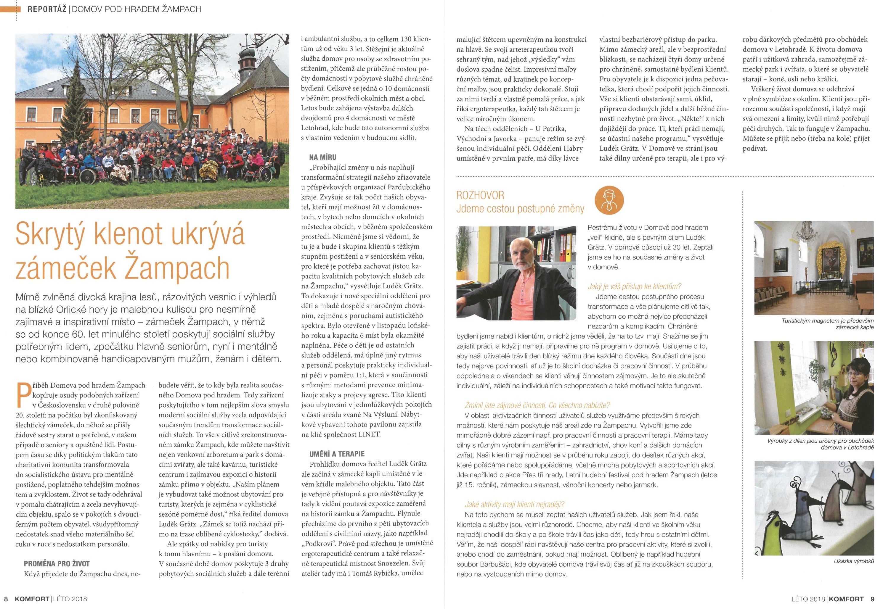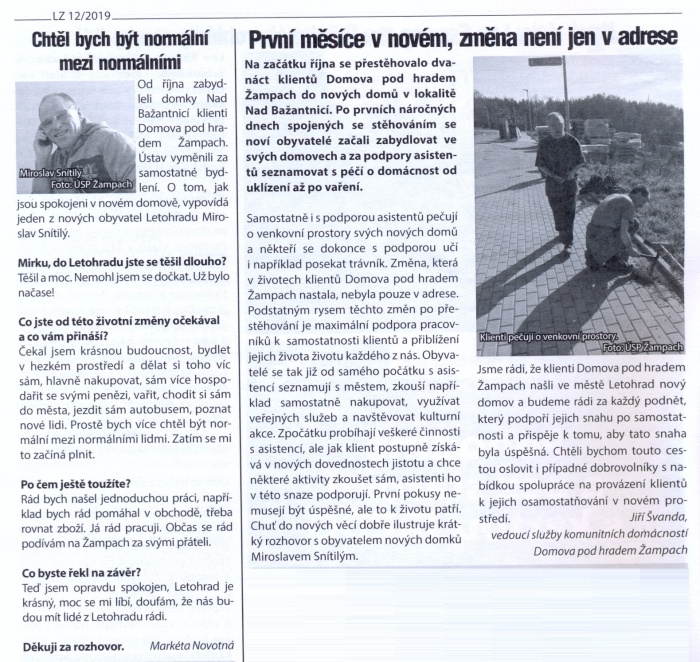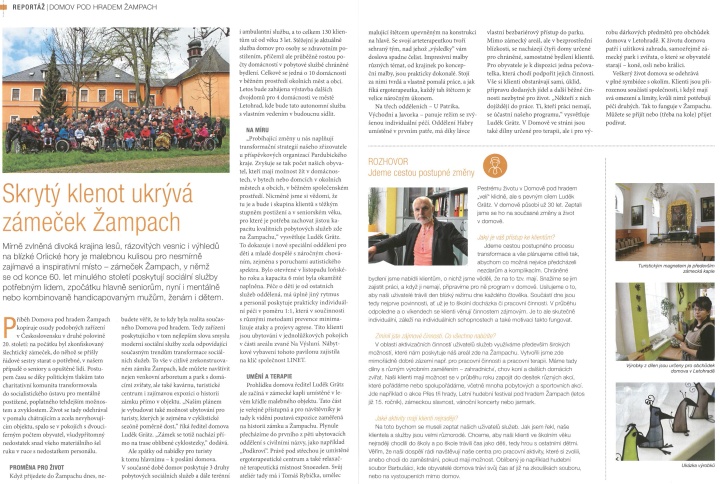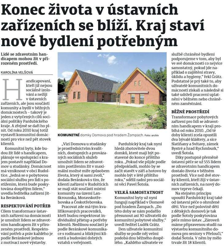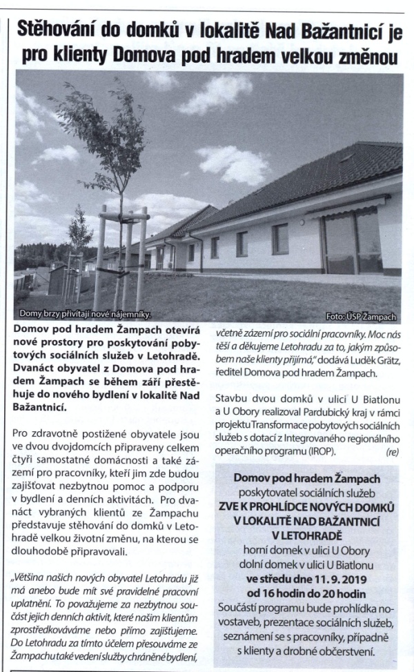 Tisková zpráva Pardubického kraje z 20.1. 2021: Tisková zpráva 1 na www deníku Novinový výstřižek 1 - zde TISKOVÁ ZPRÁVA: Domov pod hradem Žampach otevírá nové prostory pro poskytování pobytových sociálních služeb v Letohradě. Dvanáct obyvatel z Domova pod hradem Žampach se během září přestěhuje do nového bydlení v lokalitě Nad Bažantnicí v Letohradě. Stavbu dvou domků v ulici U Biatlonu a U Obory realizoval Pardubický kraj v rámci projektu Transformace pobytových sociálních služeb s dotací z Integrovaného regionálního operačního programu (IROP). Pro zdravotně postižené obyvatele jsou ve dvou dvojdomcích připraveny celkem čtyři samostatné domácnosti a také zázemí pro pracovníky, kteří jim zde budou zajišťovat nezbytnou pomoc a podporu v bydlení a denních aktivitách. Pro dvanáct vybraných klientů ze Žampachu představuje stěhování do domků v Letohradě velkou životní změnu, na kterou se dlouhodobě připravovali. „Většina našich nových obyvatel Letohradu již má anebo bude mít své pravidelné pracovní uplatnění. To považujeme za nezbytnou součást jejich denních aktivit, které našim klientům zprostředkováváme nebo přímo zajišťujeme. Do Letohradu za tímto účelem přesouváme ze Žampachu také vedení služby chráněné bydlení, včetně zázemí pro sociální pracovníky. Moc nás těší a děkujeme Letohradu za to, jakým způsobem naše klienty přijímá“, dodává k této informaci Luděk Grätz, ředitel Domova pod hradem Žampach. Pozvánka k prohlídce nových domků v lokalitě Nad Bažantnicí v Letohradě Domov pod hradem Žampach poskytovatel sociálních služeb srdečně zve veřejnost k prohlídce nových domků horní domek v ulici U Obory dolní domek v ulici U Biatlonu ve středu dne 11. 09. 2019 od 16:00 hodin do 20:00 hodin Součástí programu bude prohlídka novostaveb, prezentace sociálních služeb, seznámení se s pracovníky, případně s klienty a drobné občerstvení.
