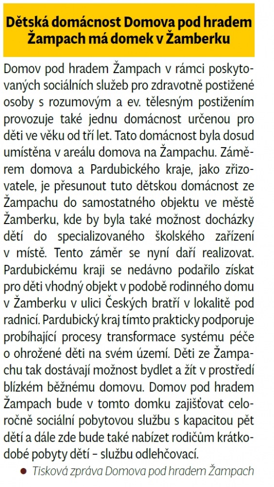 Dětská domácnost Domova pod hradem Žampach má domek v Žamberku Domov pod hradem Žampach v rámci poskytovaných sociálních služeb pro zdravotně postižené osoby s rozumovým a ev. tělesným postižením provozuje také jednu domácnost určenou pro děti ve věku od 3 let. Tato domácnost byla dosud umístěna v areálu domova na Žampachu. Záměrem domova a Pardubického kraje jako zřizovatele je přesunout tuto dětskou domácnost ze Žampachu do samostatného objektu ve městě Žamberk, kde by byla také možnost docházky dětí do specializovaného školského zařízení v místě. Tento záměr se nyní daří realizovat. Pardubickému kraji se nedávno podařilo získat pro děti vhodný objekt v podobě rodinného domu v Žamberku v ulici Českých bratří v lokalitě pod radnicí. Pardubický kraj tímto prakticky podporuje probíhající procesy transformace systému péče o ohrožené děti na svém území. Děti ze Žampachu tak dostávají možnost bydlet a žít v prostředí blízkém běžnému domovu. Domov pod hradem Žampach bude v tomto domku zajišťovat sociální pobytovou službu celoročně, a to s kapacitou 5 dětí a dále zde bude také nabízet rodičům krátkodobé pobyty dětí – službu odlehčovací. „Pokud jde o specializovanou péči, kterou domov zabezpečuje pro děti a mladé dospělé s náročným chováním (s poruchami autistického spektra), tak tato služba bude nadále provozována v areálu na Žampachu a o jejím stěhování do města my ani zřizovatel neuvažujeme. Naopak usilujeme o to, aby kapacita této nedostatkové službu byla na Žampachu v blízké době, podle možností zvýšena“, dodává k této informaci Luděk Grätz, ředitel Domova pod hradem Žampach. Tisková zpráva - Žamberecké listy 1.8. 2019 č.13/2019 V Žampachu dne 28.6. 2019